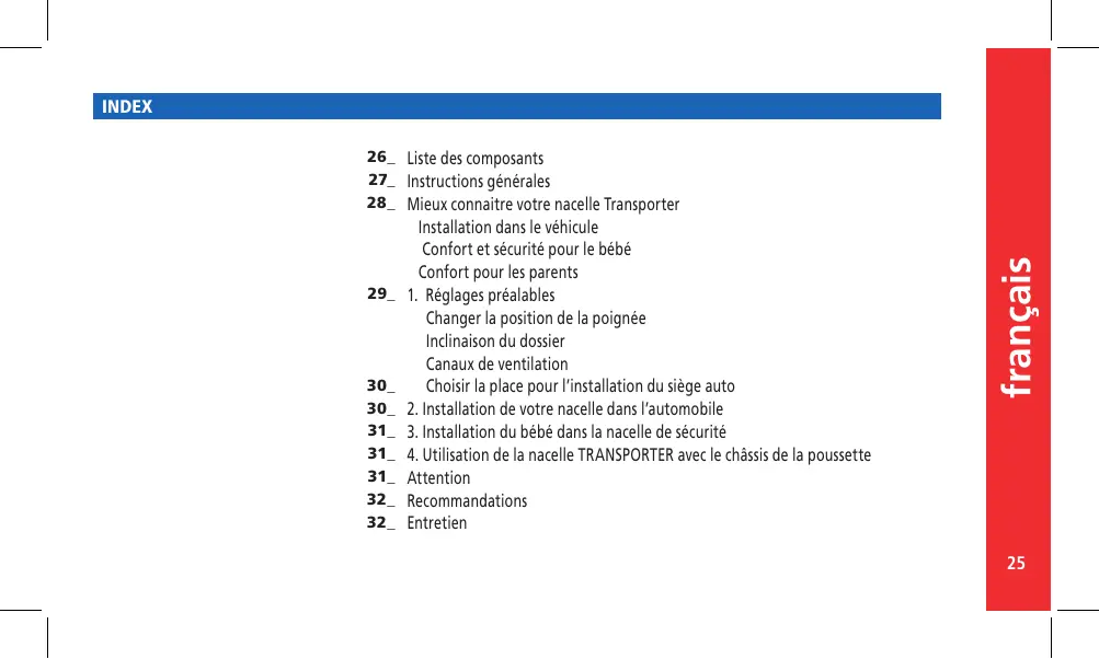 Attention Recommandations Entretien français 26_ Liste des composants 27_ Instructions générales 28_ Mieux connaitre votre nacelle Transporter