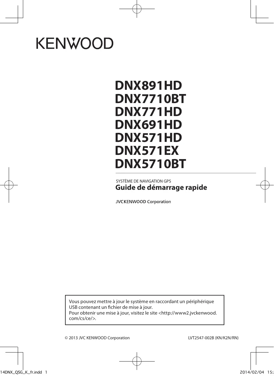 - Guide de démarrage rapide Vous pouvez mettre à jour le système en raccordant un périphérique USB contenant un fichier de mise à jour. Pour obtenir une mise à jour, visitez le site <http://www2.jvckenwood. com/cs/ce/>. © 2013 JVC KENWOOD Corporation LVT2547-002B (KN/K2N/RN) 2014/02/04 15:2 Table des matières À propos du guide de démarrage rapide p. 2