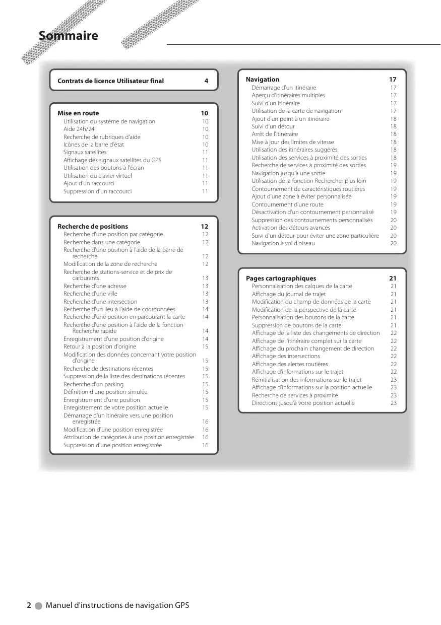 revenus ou de contrats, ni d'aucune perte indirecte résultant d'une quelconque erreur dans les données ou les Données cartographiques. Vous acceptez d'assurer et de protéger les concédants de licence, notamment Sa Majesté la Reine du chef du Canada, le ministre des Ressources naturelles du Canada et la Société canadienne des postes ainsi que leurs dirigeants, employés et mandataires contre toute réclamation, demande ou action, indépendamment de la cause intrinsèque de la réclamation, demande ou action faisant valoir des pertes, coûts, dépenses, dommages ou blessures (y compris les blessures mortelles) résultant de l'utilisation ou de la possession des données ou des Données cartographiques. Les conditions décrites dans cette section s'ajoutent à l'ensemble des droits et obligations auxquels sont assujetties les parties selon les termes du Contrat. En cas d'incohérences ou de conflit entre les dispositions de la présente section et celles du Contrat, les dispositions de cette section prévalent. Données cartographiques pour les Etats-Unis. NAVTEQ détient une licence non exclusive du United States Postal Service®, qui lui permet de publier et vendre des informations ZIP+4®. ©United States Postal Service® 2010. Les prix ne sont ni établis, ni contrôlés, ni approuvés par le United States Postal Service®. Les marques et marques déposées suivantes sont la propriété de USPS : United States Postal Service, USPS et ZIP+4. Données cartographiques pour le Canada. Les Données cartographiques pour le Canada sont fournies avec l'autorisation des autorités canadiennes, notamment : © Sa Majesté, © l'Imprimeur de la Reine pour l'Ontario, © la Société canadienne des postes, GeoBase®, © le Ministère des ressources naturelles du Canada. Tous droits réservés. Données cartographiques pour l'Australie. Les Données cartographiques pour l'Australie reposent sur des données NAVTEQ sous licence de PSMA Australia Limited (www.psma. com.au). De plus, le Produit intègre des données © 2010 Telstra Corporation Limited, GM Holden Limited, Intelematics Australia Pty Ltd, Sentinel Content Pty Limited et Continental Pty Ltd. Si votre Produit utilise les codes RDS-TMC contenus dans les Données cartographiques, les codes de position de trafic sont la propriété de © 2010 Telstra Corporation Limited et de ses concédants de licence. Durée. Le présent Contrat est en vigueur jusqu'à (i) la résiliation ou l'expiration de votre abonnement (par vous ou par Garmin), si applicable, ou (ii) la résiliation du Contrat par Garmin pour quelque raison que ce soit, y compris, mais de manière non limitative, si Garmin considère que vous avez enfreint les dispositions du présent Contrat. En outre, la résiliation d'un accord conclu entre Garmin et tout concédant de licence de données tiers mettra fin au présent Contrat. Accord intégral. Ces conditions générales constituent l'intégralité de l'accord conclu entre Garmin (et ses concédants de licence, leurs concédants de licence et revendeurs) et vous à propos de l'objet du présent contrat, et remplacent tout accord verbal ou écrit précédemment conclu entre vous et nous concernant ledit objet.