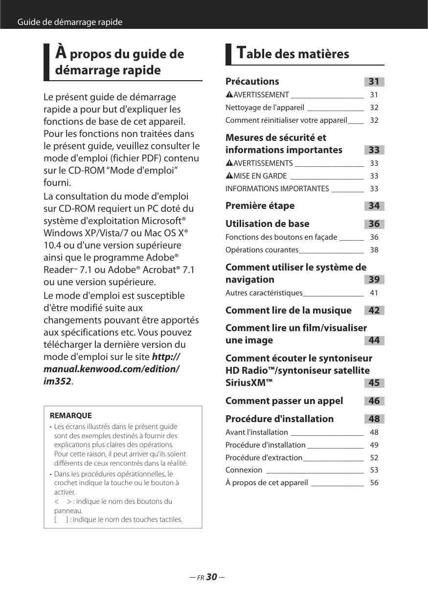 Précautions Le présent guide de démarrage rapide a pour but d'expliquer les fonctions de base de cet appareil. Pour les fonctions non traitées dans le présent guide, veuillez consulter le mode d'emploi (fichier PDF) contenu sur le CD-ROM “Mode d'emploi” fourni. La consultation du mode d'emploi sur CD-ROM requiert un PC doté du système d'exploitation Microsoft® Windows XP/Vista/7 ou Mac OS X® 10.4 ou d'une version supérieure ainsi que le programme Adobe® Reader™ 7.1 ou Adobe® Acrobat® 7.1 ou une version supérieure. Le mode d'emploi est susceptible d'être modifié suite aux changements pouvant être apportés aux spécifications etc. Vous pouvez télécharger la dernière version du mode d'emploi sur le site http:// manual.kenwood.com/edition/ im352.