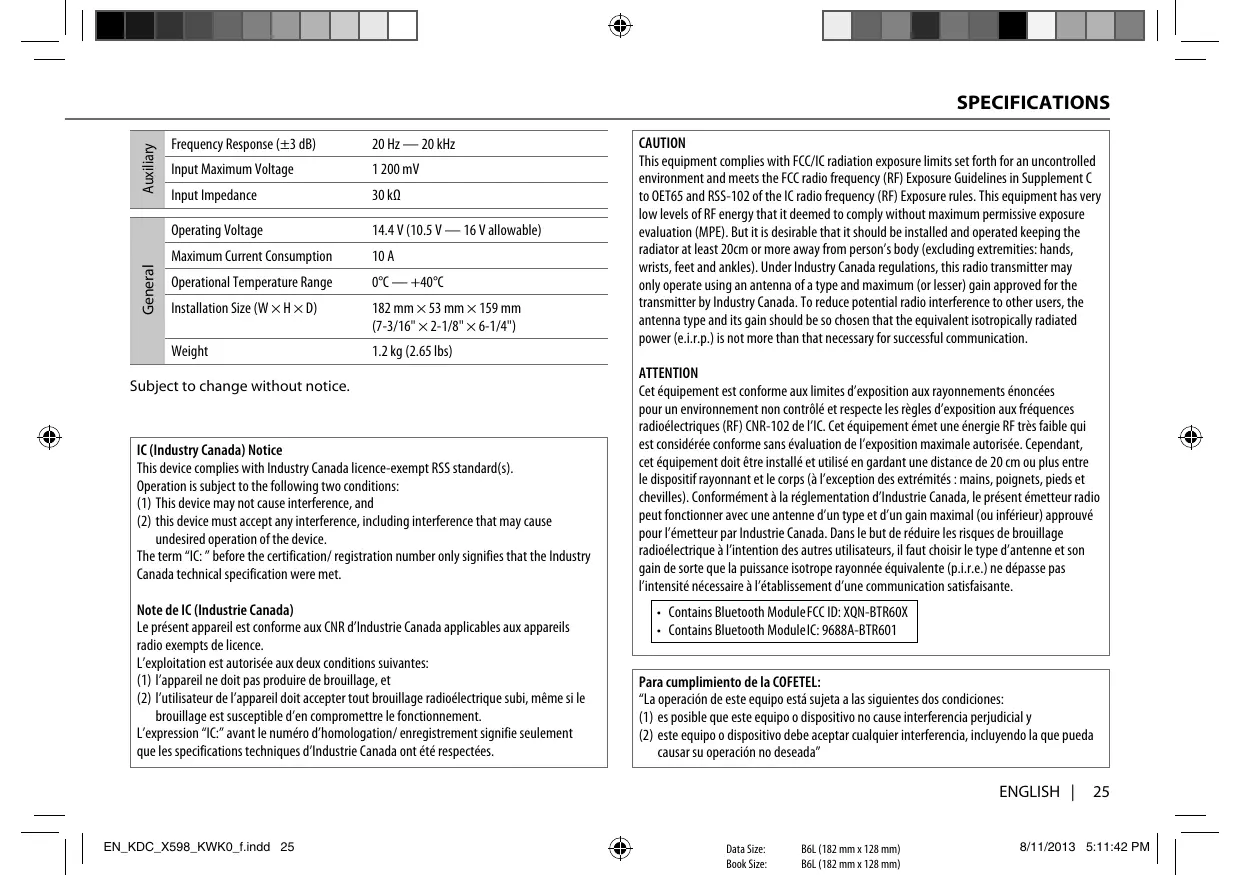 GaAIAs Puissance de sortie Filtre numérique (D/A) 8 fois suréchantillonnage Portée de communication maximale Ligne de vue approximative 10 m (32,8 pieds) Vitesse de rotation Pleurage et scintillement Non mesurables Réponse en fréquence (±1 dB) 20 Hz — 20 kHz Taux de Signal/Bruit (1 kHz) KDC-X598 : 110 dB Autres modèles: 105 dB HFP (Hands-Free Profile — Profile mains libres) SPP (Serial Port Profile — Profile de port série) PBAP (Phonebook Access Profile — Profile d’accès au répertoire d’adresses) OPP (Object Push Profile — Profile de poussée d’objet) A2DP (Advanced Audio Distribution Profile — Profile de distribution audio avancé) AVRCP (Audio/Video Remote Control Profile — Profile de télécommande audio/vidéo) Puissance de sortie maximum Pleine Puissance de Largeur de Bande Impédance d’enceinte Action en tonalité 50 W × 4 22 W × 4 (avec moins de 1 % DHT) 4Ω—8Ω Graves 200 Hz ±8 dB Médiums 2,5 kHz ±8 dB Aiguës 12,5 kHz ±8 dB KDC-X598 : 4 000 mV/10 kΩ Autres modèles: 2 500 mV/10 kΩ ≤ 600 Ω Gamme dynamique 90 dB Séparation des canaux 85 dB Décodage MP3 Compatible avec le format MPEG-1/2 Audio Layer-3 Décodeur WMA FM Plage de fréquences Niveau de préamplification/charge (CD) Impédance du préamplificateur SPÉCIFICATIONS Réponse en fréquence (±3 dB) 20 Hz — 20 kHz Tension maximum d’entrée 1 200 mV Impédance d’entrée 30 kΩ Tension de fonctionnement Consommation de courant maximale 10 A Plage de températures de fonctionnement 0°C à +40°C 182 mm × 53 mm × 159 mm (7-3/16 pouces × 2-1/8 pouces × 6-1/4 pouces) Poids 1,2 kg (2,65 livres) Sujet à changement sans notification. EN_KDC_X598_KWK0_f.indd Sec1:18