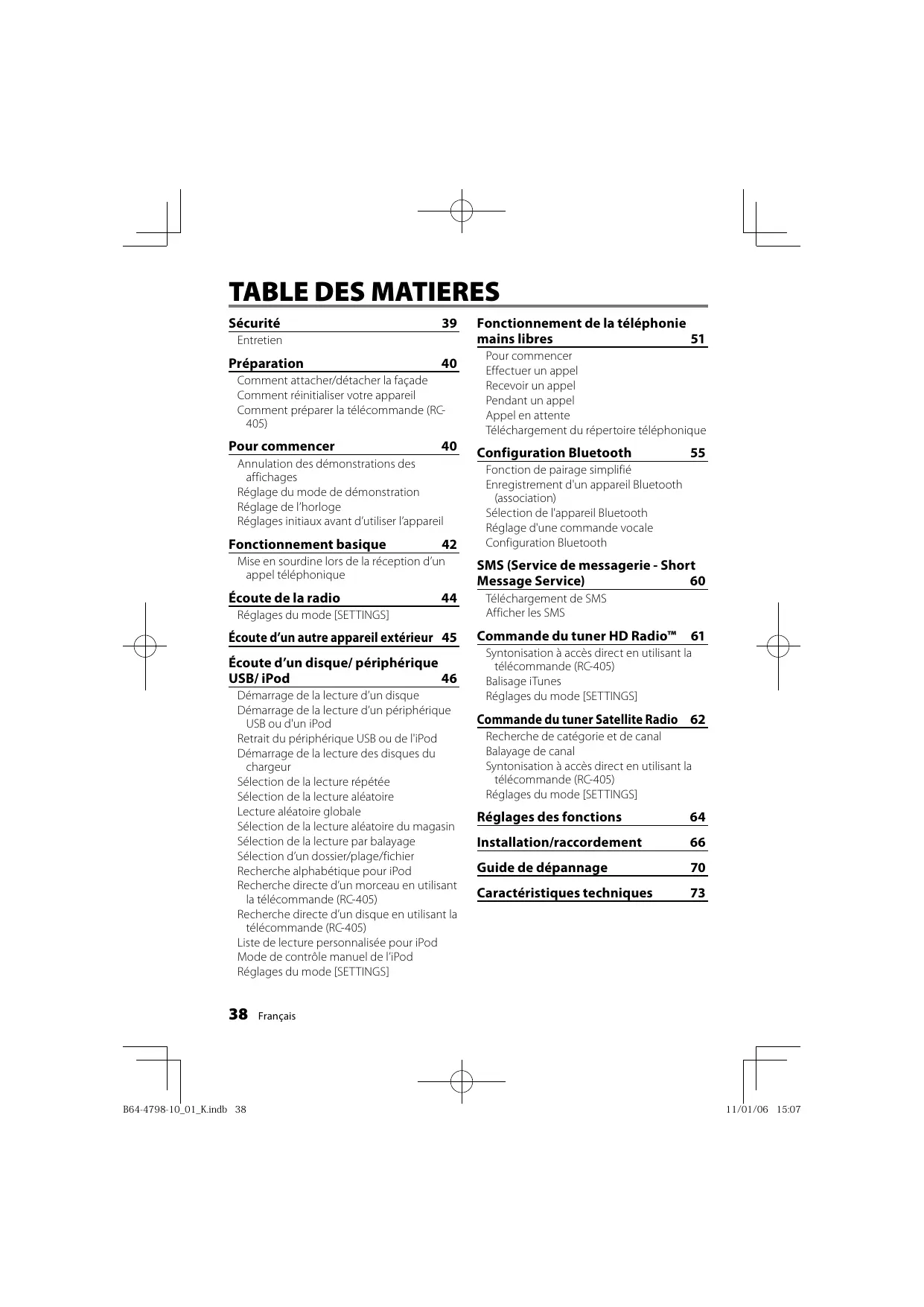 Sécurité 39 Entretien Préparation 40 Comment attacher/détacher la façade Comment réinitialiser votre appareil Comment préparer la télécommande (RC- 405) Pour commencer 40 Annulation des démonstrations des affichages Réglage du mode de démonstration Réglage de l'horloge Réglages initiaux avant d'utiliser l'appareil Fonctionnement basique 42 Mise en sourdine lors de la réception d'un appel téléphonique Écoute de la radio 44 Réglages du mode [SETTINGS] Écoute d’un autre appareil extérieur 45 Fonctionnement de la téléphonie mains libres 51 Pour commencer Effectuer un appel Recevoir un appel Pendant un appel Appel en attente Téléchargement du répertoire téléphonique Configuration Bluetooth 55 Fonction de pairage simplifié Enregistrement d'un appareil Bluetooth (association) Sélection de l'appareil Bluetooth Réglage d'une commande vocale Configuration Bluetooth SMS (Service de messagerie - Short Message Service) 60 Téléchargement de SMS Afficher les SMS Commande du tuner HD Radio" 61 Écoute d'un disque/ périphérique USB/ iPod 46 Démarrage de la lecture d'un disque Démarrage de la lecture d'un périphérique USB ou d'un iPod Retrait du périphérique USB ou de l'iPod Démarrage de la lecture des disques du chargeur Sélection de la lecture répétée Sélection de la lecture aléatoire Lecture aléatoire globale Sélection de la lecture aléatoire du magasin Sélection de la lecture par balayage Sélection d'un dossier/plage/fichier Recherche alphabétique pour iPod Recherche directe d'un morceau en utilisant la télécommande (RC-405) Recherche directe d'un disque en utilisant la télécommande (RC-405) Liste de lecture personnalisée pour iPod Mode de contrôle manuel de l'iPod Réglages du mode [SETTINGS] 38 Français B64-4798-10 01_Kindb 38 Syntonisation à accès direct en utilisant la télécommande (RC-405) Balisage iTunes Réglages du mode [SETTINGS] Commande du tuner Satellite Radio 62 Recherche de catégorie et de canal Balayage de canal Syntonisation à accès direct en utilisant la télécommande (RC-405) Réglages du mode [SETTINGS] Réglages des fonctions 64 Installation/raccordement 66 Guide de dépannage 70 Caractéristiques techniques 73
