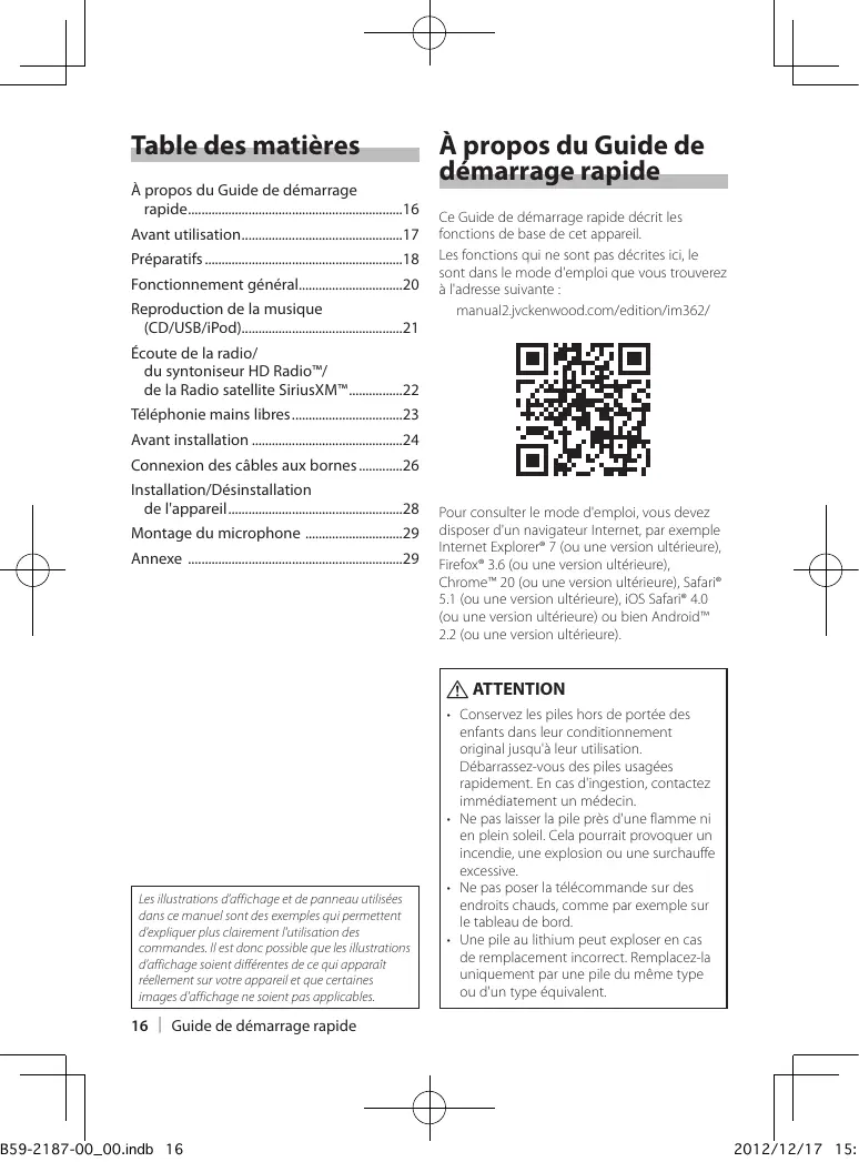 - iPhone For information on the compatibility with iPod/iPhone software, visit www.kenwood. com/cs/ce/ipod/. English | 15 12/12/17 10:5 Table des matières À propos du Guide de démarrage rapide.................................................................16 Avant utilisation.................................................17 Préparatifs............................................................18 Fonctionnement général...............................20 Reproduction de la musique (CD/USB/iPod)................................................21 À propos du Guide de démarrage rapide Ce Guide de démarrage rapide décrit les fonctions de base de cet appareil. Les fonctions qui ne sont pas décrites ici, le sont dans le mode d'emploi que vous trouverez à l'adresse suivante : manual2.jvckenwood.com/edition/im362/ Écoute de la radio/ du syntoniseur HD Radio™/ de la Radio satellite SiriusXM™.................22 Téléphonie mains libres..................................23 Avant installation..............................................24 Connexion des câbles aux bornes..............26 Installation/Désinstallation de l'appareil.....................................................28 Montage du microphone ..............................29 Annexe .................................................................29 Pour consulter le mode d'emploi, vous devez disposer d'un navigateur Internet, par exemple Internet Explorer® 7 (ou une version ultérieure), Firefox® 3.6 (ou une version ultérieure), Chrome™ 20 (ou une version ultérieure), Safari®