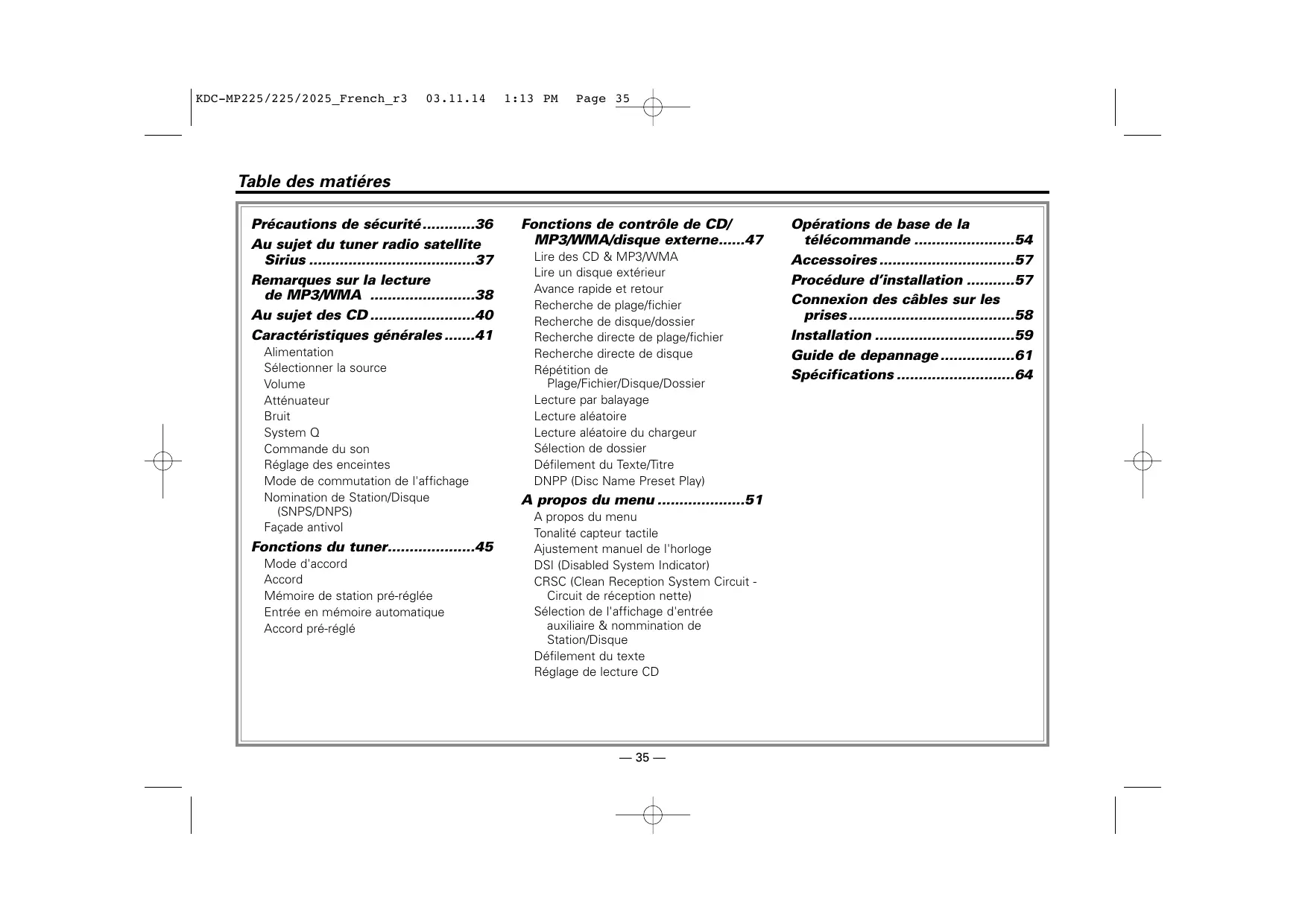 Fonctions de contrôle de CD/ MP3/NMA/disque externe. Lire des CD & MP3/WMA Lire un disque extérieur Avance rapide et retour Recherche de plage/fichier Recherche de disque/dossier Recherche directe de plage/fichier Recherche directe de disque Répétition de Plage/Fichier/Disque/Dossier Lecture par balayage Lecture aléatoire Lecture aléatoire du chargeur Sélection de dossier Défilement du Texte/Titre DNPP (Disc Name Preset Play) A propos du menu …. À propos du menu Tonalité capteur tactile Ajustement manuel de l'horloge DSI (Disabled System Indicator) CRSC (Clean Reception System Circuit - Circuit de réception nette) Sélection de l'affichage d'entrée auxiliaire & nommination de Station/Disque Défilement du texte Réglage de lecture CD Opérations de base de la télécommande . Accessoires . Procédure d'installation . Connexion des câbles sur les Guide de depannage … Spécifications … —_35—