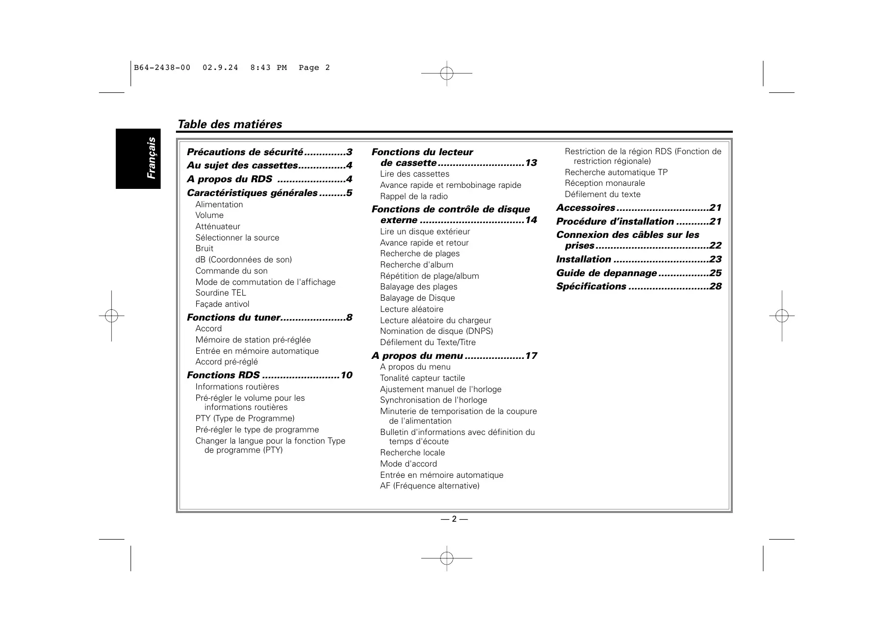 Table des matiéres Précautions de sécurité3 Au sujet des cassettes4 A propos du RDS 4 Caractéristiques générales 5 Alimentation Volume Atténuateur Sélectionner la source Bruit dB (Coordonnées de son) Commande du son Mode de commutation de l'affichage Sourdine TEL Façade antivol