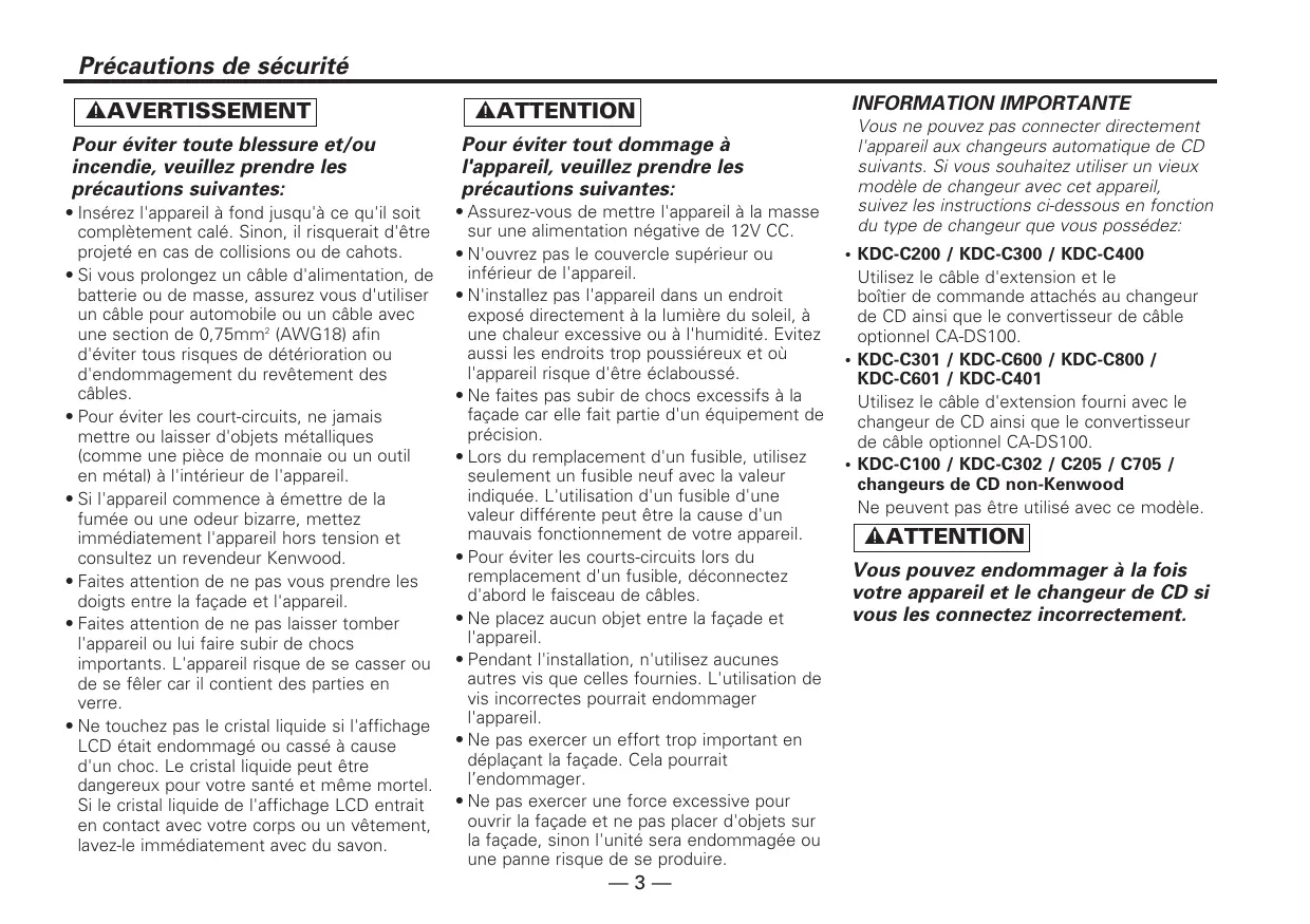 Précautions de sécurité 2AVERTISSEMENT Pour éviter toute blessure et/ou incendie, veuillez prendre les précautions suivantes: • Insérez l'appareil à fond jusqu'à ce qu'il soit complètement calé. Sinon, il risquerait d'être projeté en cas de collisions ou de cahots. • Si vous prolongez un câble d'alimentation, de batterie ou de masse, assurez vous d'utiliser un câble pour automobile ou un câble avec une section de 0,75mm2 (AWG18) afin d'éviter tous risques de détérioration ou d'endommagement du revêtement des câbles. • Pour éviter les court-circuits, ne jamais mettre ou laisser d'objets métalliques (comme une pièce de monnaie ou un outil en métal) à l'intérieur de l'appareil. • Si l'appareil commence à émettre de la fumée ou une odeur bizarre, mettez immédiatement l'appareil hors tension et consultez un revendeur Kenwood. • Faites attention de ne pas vous prendre les doigts entre la façade et l'appareil. • Faites attention de ne pas laisser tomber l'appareil ou lui faire subir de chocs importants. L'appareil risque de se casser ou de se fêler car il contient des parties en verre. • Ne touchez pas le cristal liquide si l'affichage LCD était endommagé ou cassé à cause d'un choc. Le cristal liquide peut être dangereux pour votre santé et même mortel. Si le cristal liquide de l'affichage LCD entrait en contact avec votre corps ou un vêtement, lavez-le immédiatement avec du savon.