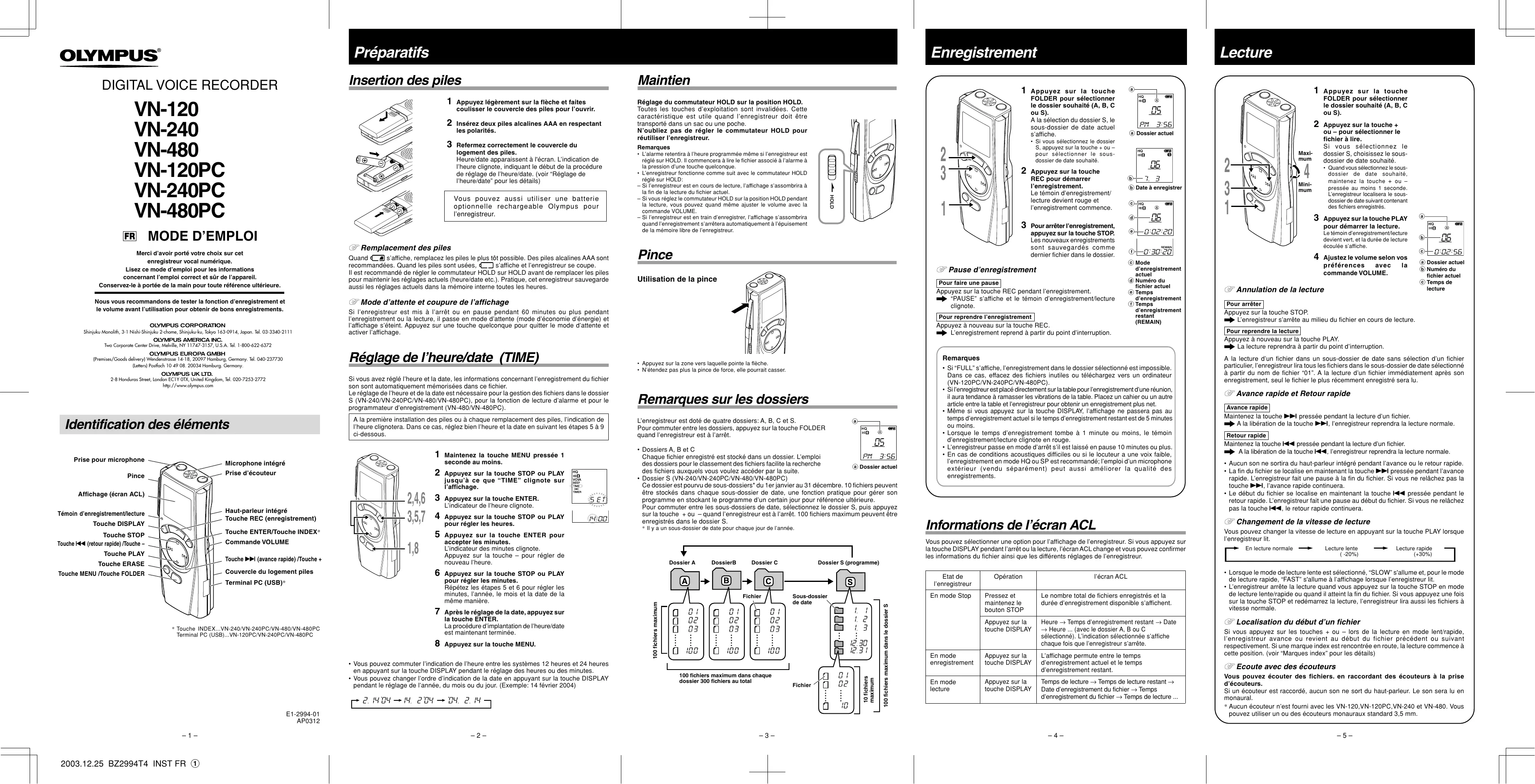 - Heure ... (avec le dossier A, B ou C sélectionné). L’indication sélectionnée s’affiche chaque fois que l’enregistreur s’arrête. En mode enregistrement Appuyez sur la touche DISPLAY L’affichage permute entre le temps d’enregistrement actuel et le temps d’enregistrement restant. En mode lecture Appuyez sur la touche DISPLAY Temps de lecture → Temps de lecture restant → Date d’enregistrement du fichier → Temps d’enregistrement du fichier → Temps de lecture ... E1-2994-01 AP0312 –1–