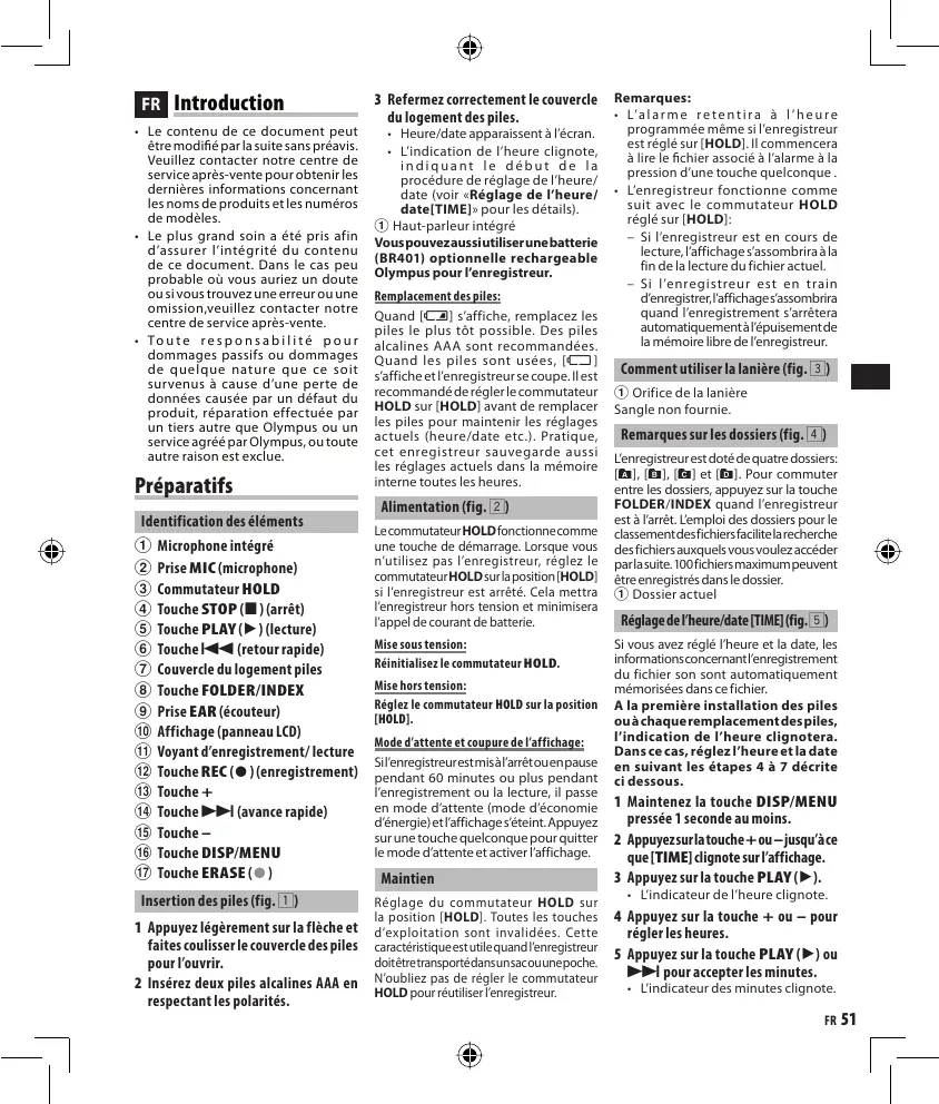- L’indication de l’heure clignote, indiquant le début de la procédure de réglage de l’heure/ date (voir «Réglage de l’heure/ date[TIME]» pour les détails). 1 Haut-parleur intégré Vous pouvez aussi utiliser une batterie (BR401) optionnelle rechargeable Olympus pour l’enregistreur. Remplacement des piles: Quand [N] s’affiche, remplacez les piles le plus tôt possible. Des piles alcalines AAA sont recommandées. Quand les piles sont usées, [O ] s’affiche et l’enregistreur se coupe. Il est recommandé de régler le commutateur HOLD sur [HOLD] avant de remplacer les piles pour maintenir les réglages actuels (heure/date etc.). Pratique, cet enregistreur sauvegarde aussi les réglages actuels dans la mémoire interne toutes les heures. Alimentation (fig. 2) Le commutateur HOLD fonctionne comme une touche de démarrage. Lorsque vous n’utilisez pas l’enregistreur, réglez le commutateur HOLD sur la position [HOLD] si l’enregistreur est arrêté. Cela mettra l’enregistreur hors tension et minimisera l’appel de courant de batterie. Mise sous tension: Réinitialisez le commutateur HOLD. Mise hors tension: Réglez le commutateur HOLD sur la position [HOLD]. Mode d’attente et coupure de l’affichage: Si l’enregistreur est mis à l’arrêt ou en pause pendant 60 minutes ou plus pendant l’enregistrement ou la lecture, il passe en mode d’attente (mode d’économie d’énergie) et l’affichage s’éteint. Appuyez sur une touche quelconque pour quitter le mode d’attente et activer l’affichage. Maintien Réglage du commutateur HOLD sur la position [HOLD]. Toutes les touches d’exploitation sont invalidées. Cette caractéristique est utile quand l’enregistreur doit être transporté dans un sac ou une poche. N’oubliez pas de régler le commutateur HOLD pour réutiliser l’enregistreur. Remarques: