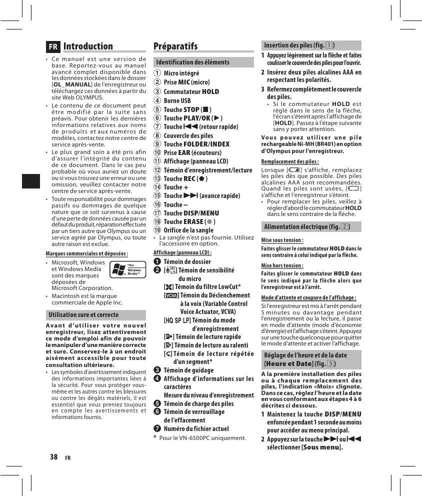 - Pour remplacer les piles, veillez à régler d’abord le commutateur HOLD dans le sens contraire de la flèche. Alimentation électrique (fig. 2) Mise sous tension : Faites glisser le commutateur HOLD dans le sens contraire à celui indiqué par la flèche. Mise hors tension : Faites glisser le commutateur HOLD dans le sens indiqué par la flèche alors que l’enregistreur est à l’arrêt. Mode d’attente et coupure de l’affichage : Si l’enregistreur est mis à l’arrêt pendant 5 minutes ou davantage pendant l’enregistrement ou la lecture, il passe en mode d’attente (mode d’économie d’énergie) et l’affichage s’éteint. Appuyez sur une touche quelconque pour quitter le mode d’attente et activer l’affichage. Réglage de l’heure et de la date [Heure et Date] (fig. 3) A la première installation des piles ou à chaque remplacement des piles, l’indication «Mois» clignote. Dans ce cas, réglez l’heure et la date en vous conformant aux étapes 4 à 6 décrites ci dessous. 1 Maintenez la touche DISP/MENU enfoncée pendant 1 seconde au moins pour accéder au menu principal. 2 Appuyez sur la touche 9 ou 0 sélectionner [Sous menu]. 3 Appuyez sur la touche PLAY/OK ( `).