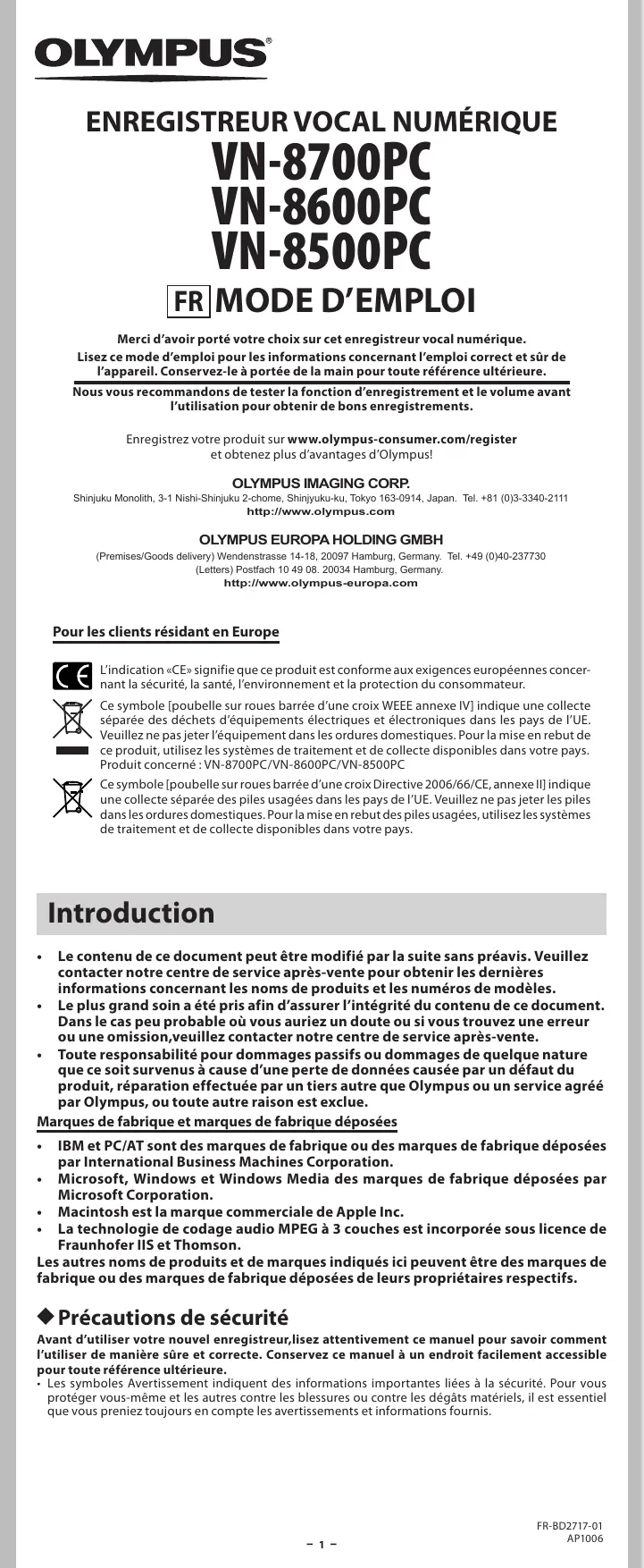(Premises/Goods delivery) Wendenstrasse 14-18, 20097 Hamburg, Germany. Tel. +49 (0)40-237730 (Letters) Postfach 10 49 08. 20034 Hamburg, Germany. http://www.olympus-europa.com Pour les clients résidant en Europe L’indication «CE» signifie que ce produit est conforme aux exigences européennes concernant la sécurité, la santé, l’environnement et la protection du consommateur. Ce symbole [poubelle sur roues barrée d’une croix WEEE annexe IV] indique une collecte séparée des déchets d’équipements électriques et électroniques dans les pays de l’UE. Veuillez ne pas jeter l’équipement dans les ordures domestiques. Pour la mise en rebut de ce produit, utilisez les systèmes de traitement et de collecte disponibles dans votre pays. Produit concerné : VN-8700PC/VN-8600PC/VN-8500PC Ce symbole [poubelle sur roues barrée d’une croix Directive 2006/66/CE, annexe II] indique une collecte séparée des piles usagées dans les pays de l’UE. Veuillez ne pas jeter les piles dans les ordures domestiques. Pour la mise en rebut des piles usagées, utilisez les systèmes de traitement et de collecte disponibles dans votre pays. Introduction