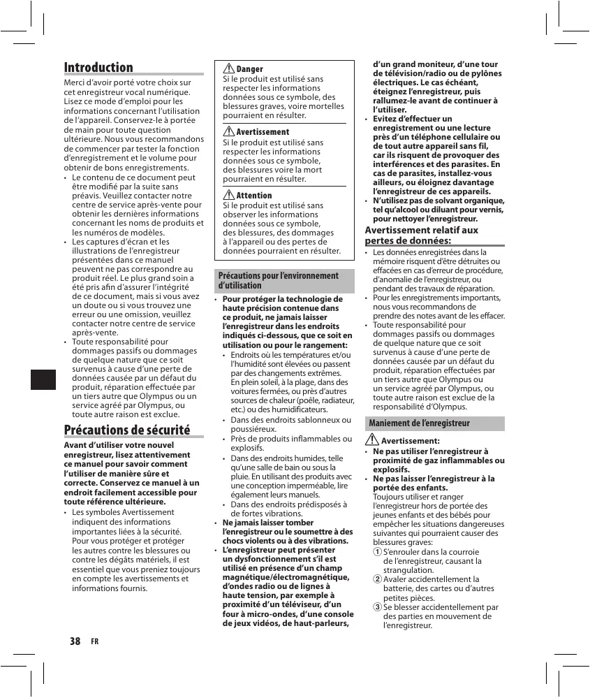 • Ne jamais ranger la batterie dans un lieu où elle serait exposée en plein soleil, ou sujette à des températures élevées dans un véhicule chaud, près d’une source de chaleur, etc. • Pour éviter de causer des coulages de liquide de la batterie ou d’endommager ses bornes, respectez scrupuleusement toutes les instructions concernant l’usage de la batterie. Ne jamais tenter de démonter une batterie ni la modifier de quelque façon que ce soit, ni la souder, etc. • Si du liquide de la batterie entrait dans vos yeux, les laver immédiatement avec de l’eau claire et froide du robinet et consultez immédiatement un médecin. f Avertissement: • Maintenir à tout moment la batterie au sec. • Ne pas utiliser une batterie si elle est endommagée ou cassée. • Ne jamais soumettre la batterie à des chocs violents ni à des vibrations continues. • Si la batterie coule, devient décolorée ou déformée, ou devient anormale sous d’autres aspects pendant le fonctionnement, arrêter d’utiliser l’enregistreur. • Si du liquide de la batterie coule sur vos vêtements ou sur votre peau, retirez le vêtement et laver immédiatement la zone affectée avec de l’eau claire et froide du robinet. Si le liquide vous brûle la peau, consultez immédiatement un médecin. • Conservez les piles hors de portée des enfants. • Si vous notez quelque chose d’inhabituel à l’utilisation de ce produit, par exemple un bruit anormal, de la chaleur, de la fumée ou une odeur de brûlé: 1 retirez immédiatement les piles en prenant garde de ne pas vous brûler, et; 2 appelez votre revendeur ou le représentant Olympus local pour une révision.