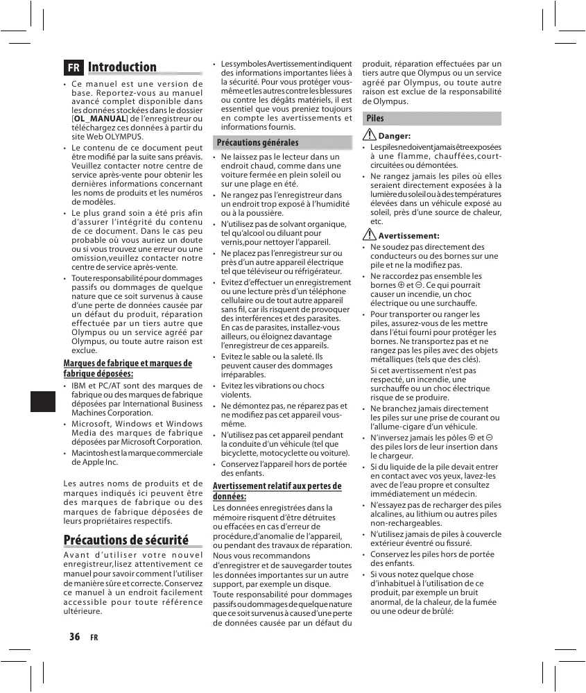 8 kHz, 11 kHz, 16 kHz, 22 kHz, 32 kHz, 44,1 kHz, 48 kHz • Le contenu de ce document peut être modifié par la suite sans préavis. Veuillez contacter notre centre de service après-vente pour obtenir les dernières informations concernant les noms de produits et les numéros de modèles. • Le plus grand soin a été pris afin d’assurer l’intégrité du contenu de ce document. Dans le cas peu probable où vous auriez un doute ou si vous trouvez une erreur ou une omission,veuillez contacter notre centre de service après-vente. • Toute responsabilité pour dommages passifs ou dommages de quelque nature que ce soit survenus à cause d’une perte de données causée par un défaut du produit, réparation effectuée par un tiers autre que Olympus ou un service agréé par Olympus, ou toute autre raison est exclue.