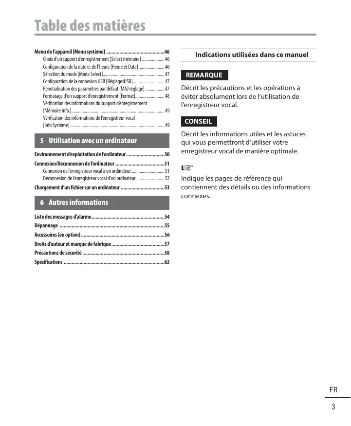 Table des matières Indications utilisées dans ce manuel Menu de l'appareil [Menu système] 46 Ghad'ur support d'enregistrement Slect méaïe] n Cafiguration ea date ete l'heure [Heure et Date] n Sélection du mode {Made Select. 4 Cafigurtion de a comneon US8 (Réglages SE] a Bénitaation es paramètres par défaut [MAI réglage] a Formatage d'un support enregistrement [Format 3 Vacation desinformatons dusupport deregstement {Némoie nf} # Vélo dsinformatosdelemegistreur vocal {info Système] # 5 Utilisation avecun ordinateur Environnement exploitation de l'ordinateur Connexn/Déconnenion de l'ordinateur Canneion de lenregisreur vocal un rater. 51 Déconneion de teregstreurvcaldun crnateur 52 Chargement d'un fihier sur un ordinateur … Lise desmesage d'alarme Dépamage Access (en api) Pros d'auteur et marque efarique. Préautonsdeséarté Spécifications REMARQUE Décrit les précautions et les opérations à éviter absolument lors de l’utilisation de l'enregistreur vocal. Décrit les informations utiles et les astuces qui vous permettront d'utiliser votre enregistreur vocal de manière optimale. Les Indique les pages de référence qui contiennent des détails ou des informations connexes.