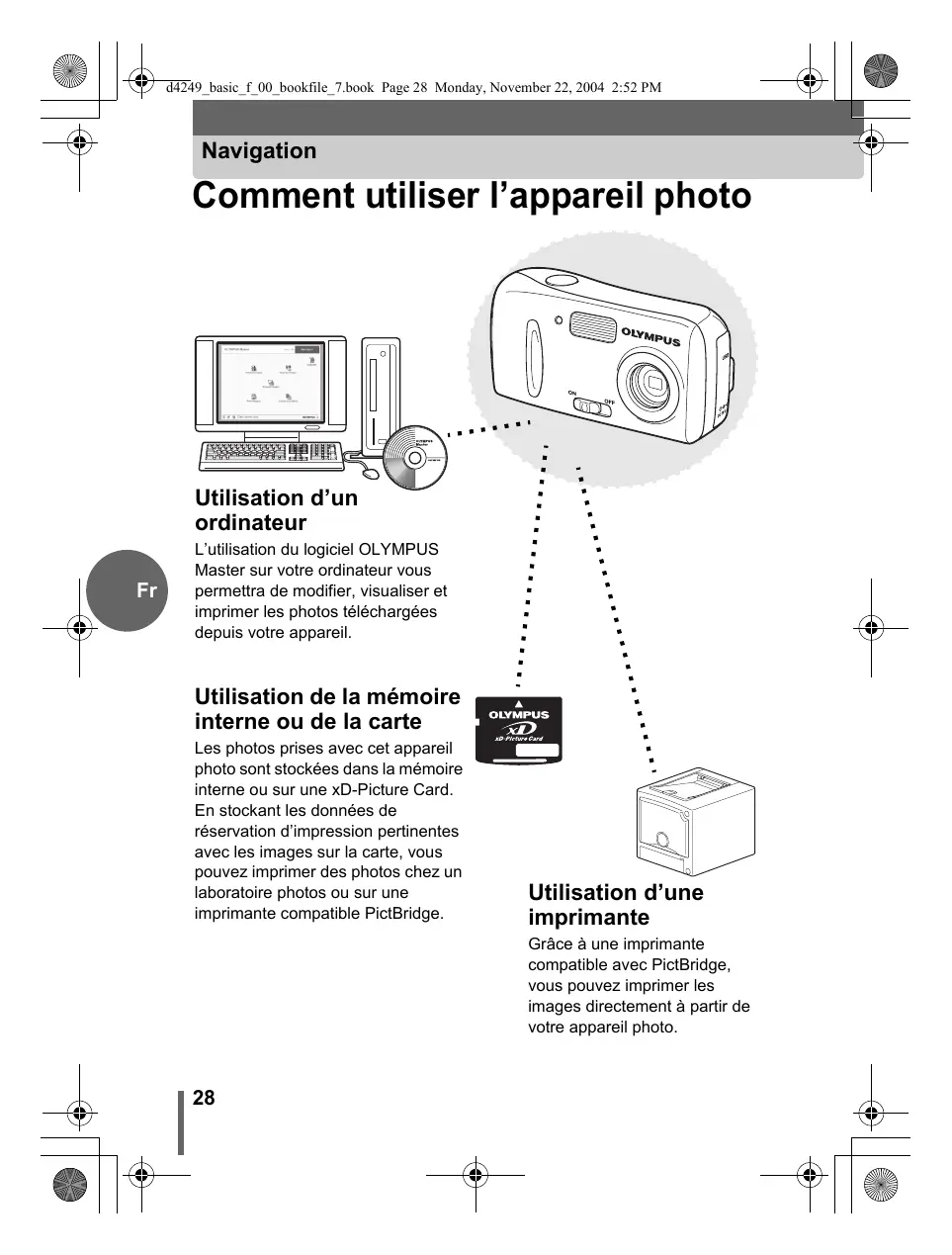 L’utilisation du logiciel OLYMPUS Master sur votre ordinateur vous permettra de modifier, visualiser et imprimer les photos téléchargées depuis votre appareil. Utilisation de la mémoire interne ou de la carte Les photos prises avec cet appareil photo sont stockées dans la mémoire interne ou sur une xD-Picture Card. En stockant les données de réservation d’impression pertinentes avec les images sur la carte, vous pouvez imprimer des photos chez un laboratoire photos ou sur une imprimante compatible PictBridge. Utilisation d’une imprimante Grâce à une imprimante compatible avec PictBridge, vous pouvez imprimer les images directement à partir de votre appareil photo.