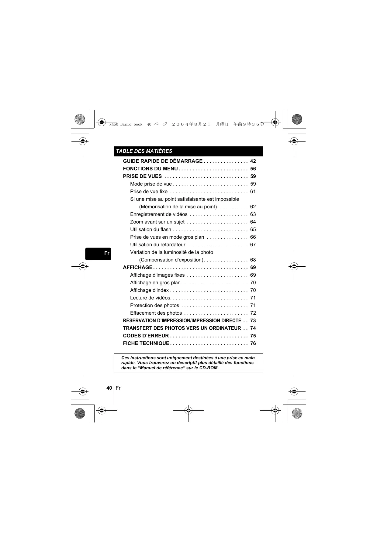 FICHE TECHNIQUE . . . . . . . . . . . . . . . . . . . . . . . . . . . . 76 Ces instructions sont uniquement destinées à une prise en main rapide. Vous trouverez un descriptif plus détaillé des fonctions dans le “Manuel de référence” sur le CD-ROM. 40 Fr x450_Basic.book 41 ページ