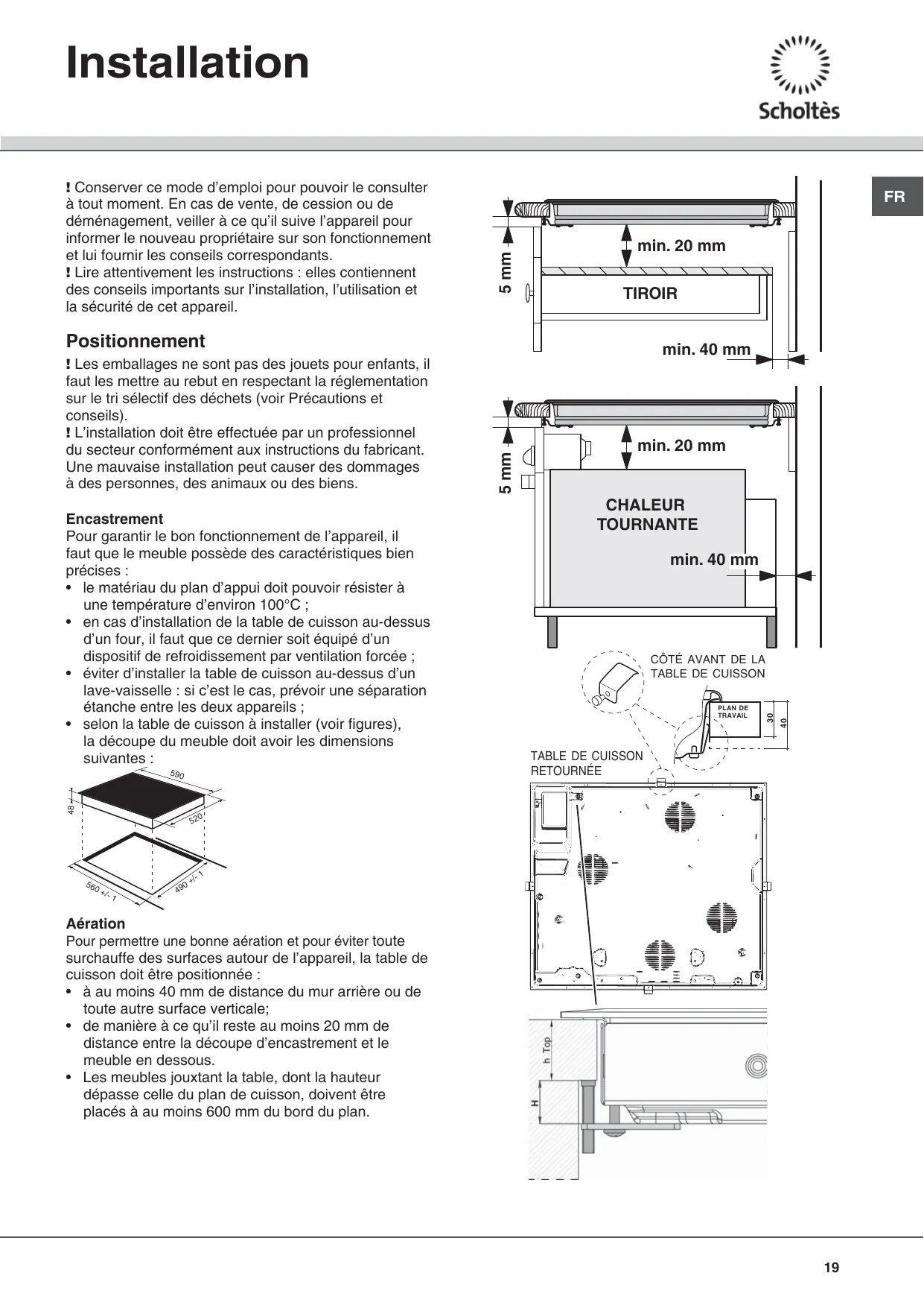 • à au moins 40 mm de distance du mur arrière ou de toute autre surface verticale; • de manière à ce qu’il reste au moins 20 mm de distance entre la découpe d’encastrement et le meuble en dessous. • Les meubles jouxtant la table, dont la hauteur dépasse celle du plan de cuisson, doivent être placés à au moins 600 mm du bord du plan.