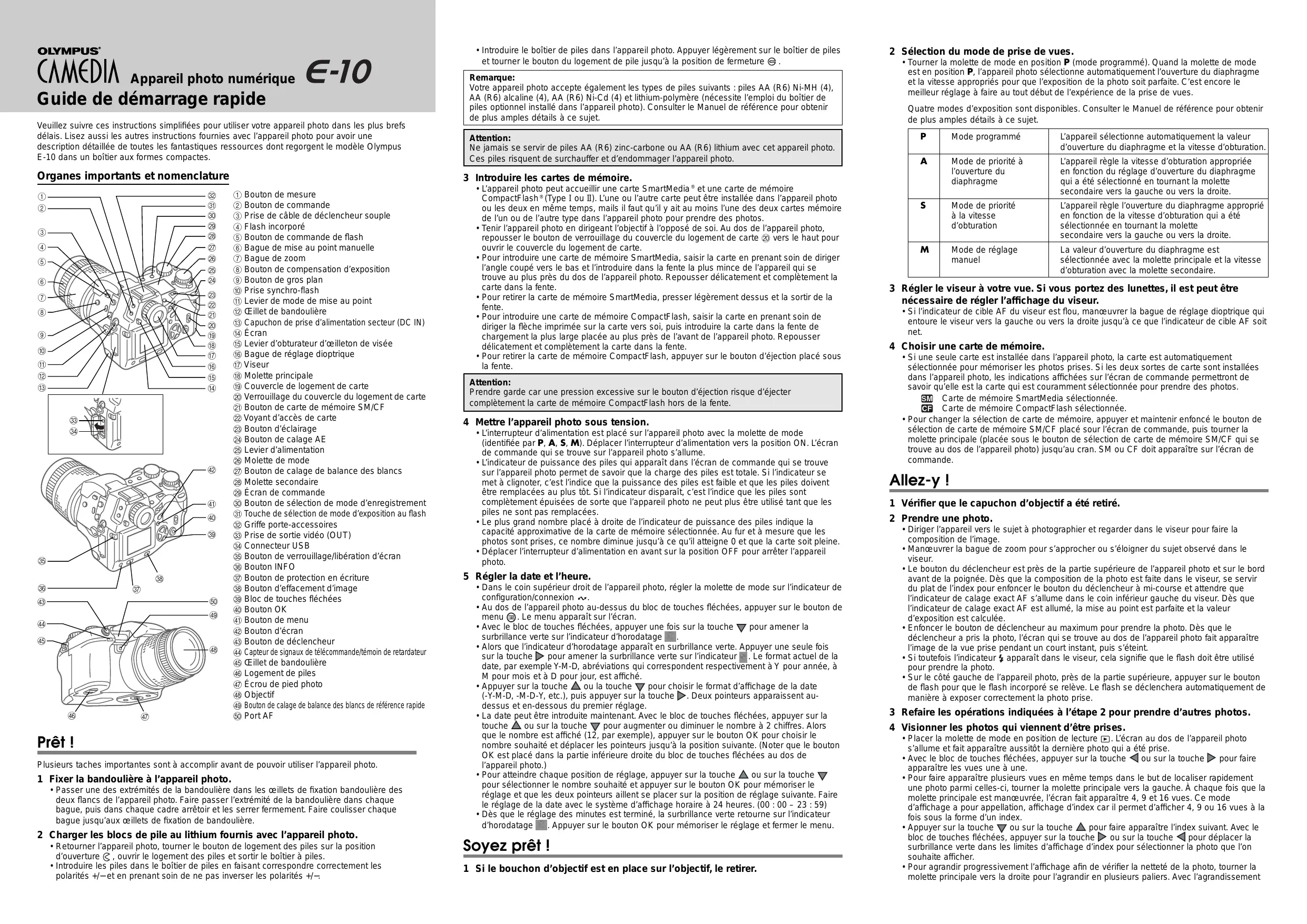 OLYMPUS" CAMEDIA Appareil photo numérique E:-10 Guide de démarrage rapide Veuillez suivre ces instructions simplifiées pour utiliser votre appareil photo dans les plus brefs délais. Lisez aussi les autres instructions fournies avec l'appareil photo pour avoir une description détaillée de toutes les fantastiques ressources dont regorgent le modèle Olympus E-10 dans un boîtier aux formes compactes. Organes importants et nomenclature ( Bouton de mesure & Bouton de commande @ Prise de câble de déclencheur souple @ Flash incorporé © Bague de mise au point manuelle Bague de zoom @ Bouton de compensation d'exposition @ Bouton de gros plan & Prise synchro-flash « Levier de mode de mise au point «2 Œillet de bandoulière € Capuchon de prise d'alimentation secteur (DC IN) #) Écran 5 Levier d'obturateur d'œilleton de visée &5 Bague de réglage dioptrique D Viseur & Molette principale 4 Couvercle de logement de carte & Verrouillage du couvercle du logement de carte &) Bouton de carte de mémoire SM/CF @ Voyant d'accès de carte & Bouton d'éclairage & Bouton de calage AE & Levier d'alimentation & Molette de mode & Bouton de calage de balance des blancs & Molette secondaire @ Écran de commande & Bouton de sélection de mode d'enregistrement & Touche de sélection de mode d'exposition au flash & Griffe porte-accessoires & Prise de sortie vidéo (OUT) & Connecteur USB & Bouton de verrouillage/libération d'écran € Bouton INFO & Bouton de protection en écriture 4 Bouton d'effacement d'image & Bloc de touches fléchées & Bouton OK &ÿ Bouton de menu & Bouton d'écran & Bouton de déclencheur &@ Capteur de signaux de télécommande/témoin de retardateur & Œillet de bandoulière & Logement de piles & Écrou de pied photo & Objectif & Bouton de calage de balance des blancs de référence rapide 4 PortAF Prêt ! Plusieurs taches importantes sont à accomplir avant de pouvoir utliser l'appareil photo. 1 Fixer la bandoulière à l'appareil photo. + Passer une des extrémités de la bandoulière dans les œillets de fixation bandoulière des deux flancs de l'appareil photo. Faire passer l'extrémité de la bandoulière dans chaque bague, puis dans chaque cadre arrêtoir et les serrer fermement. Faire coulisser chaque bague jusqu'aux œillets de fixation de bandoulière. 2 Charger les blocs de pile au lithium fournis avec l'appareil photo. + Retourner l'appareil photo, tourner le bouton de logement des piles sur la position d'ouverture @ , ouvrir le logement des piles et sortir le boîtier à piles. + Introduire les piles dans le boîtier de piles en faisant correspondre correctement les polarités #/—et en prenant soin de ne pas inverser les polarités +/— + Introduire le boîtier de piles dans l'appareil photo. Appuyer légèrement sur le boîtier de piles et tourner le bouton du logement de pile jusqu'à la position de fermeture @ Remarque Votre appareil photo accepte également les types de piles suivants : piles AA (R6) Ni-MH (4), AA (R6) alcaline (4), AA (R6) Ni-Cd (4) et lithium-polymère (nécessite l'emploi du boîtier de piles optionnel installé dans l'appareil photo). Consulter le Manuel de référence pour obtenir de plus amples détails à ce sujet. Attention: Ne jamais se servir de piles AA (R6) zinc-carbone ou AA (R6) lithium avec cet appareil photo. Ces piles risquent de surchauffer et d'endommager l'appareil photo. 3 introduire les cartes de mémoire. + L'appareil photo peut accueillir une carte SmartMedia ® et une carte de mémoire CompactFlash ® (Type 1 ou Il). L'une ou l'autre carte peut être installée dans l'appareil photo ou les deux en même temps, mails il faut qu'il y ait au moins l'une des deux cartes mémoire de l'un ou de l'autre type dans l'appareil photo pour prendre des photos. + Tenir l'appareil photo en dirigeant l'objectif à l'opposé de soi. Au dos de l'appareil photo, repousser le bouton de verrouillage du couvercle du logement de carte & vers le haut pour ouvrir le couvercle du logement de carte. + Pour introduire une carte de mémoire SmartMedia, saisir la carte en prenant soin de diriger l'angle coupé vers le bas et l'introduire dans la fente la plus mince de l'appareil qui se trouve au plus près du dos de l'appareil photo. Repousser délicatement et complètement la carte dans la fente. + Pour retirer la carte de mémoire SmartMedia, presser légèrement dessus et la sortir de la fente. + Pour introduire une carte de mémoire CompactFlash, saisir la carte en prenant soin de diriger la flèche imprimée sur la carte vers soi, puis introduire la carte dans la fente de chargement la plus large placée au plus près de l'avant de l'appareil photo. Repousser délicatement et complètement la carte dans la fente. + Pour retirer la carte de mémoire CompactFlash, appuyer sur le bouton d'éjection placé sous la fente. Attention: Prendre garde car une pression excessive sur le bouton d'éjection risque d'éjecter complètement la carte de mémoire CompactFlash hors de la fente. 4 Mettre l'appareil photo sous tension. + L'interrupteur d'alimentation est placé sur l'appareil photo avec la molette de mode {identifiée par P, A, S, M). Déplacer l'interrupteur d'alimentation vers la position ON. L'écran de commande qui se trouve sur l'appareil photo s'allume. + L'indicateur de puissance des piles qui apparaît dans l'écran de commande qui se trouve sur l'appareil photo permet de savoir que la charge des piles est totale. Si l'indicateur se met à clignoter, c'est l'indice que la puissance des piles est faible et que les piles doivent être remplacées au plus tôt Si l'indicateur disparaît, c'est l'indice que les piles sont complètement épuisées de sorte que l'appareil photo ne peut plus être utilisé tant que les piles ne sont pas remplacées. + Le plus grand nombre placé à droite de l'indicateur de puissance des piles indique la capacité approximative de la carte de mémoire sélectionnée. Au fur et à mesure que les photos sont pr