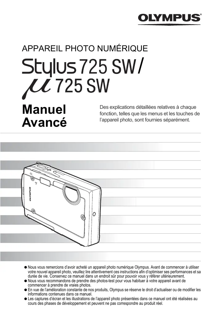 Téléchargez la notice de votre Appareil photo compact au format PDF gratuitement ! Retrouvez votre notice MU 725 - OLYMPUS et reprennez votre appareil électronique en main. Sur cette page sont publiés tous les documents nécessaires à l'utilisation de votre appareil MU 725 de la marque OLYMPUS.
