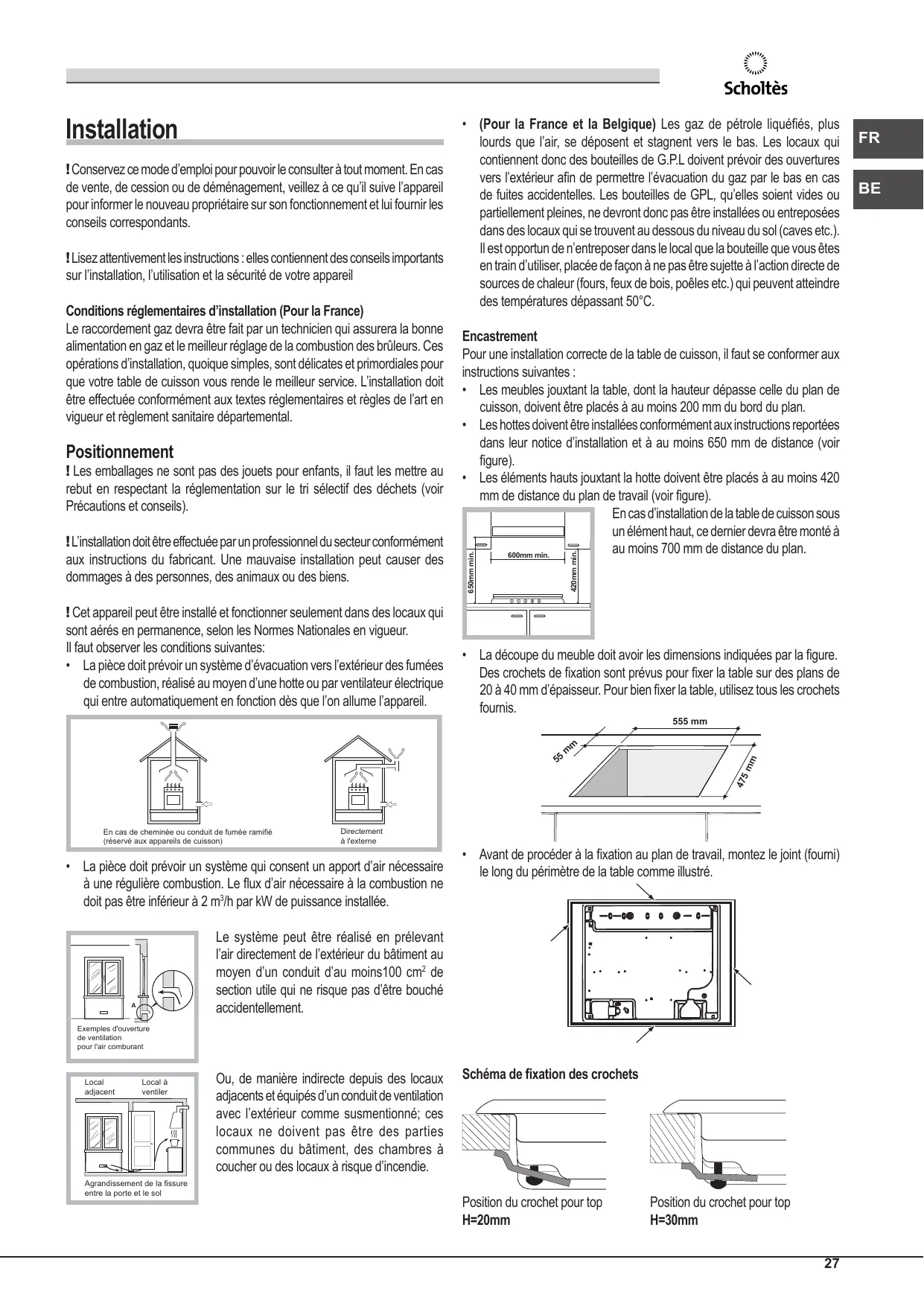 Exemples d'ouverture de ventilation pour l'air comburant Local adjacent Local à ventiler Agrandissement de la fissure entre la porte et le sol Ou, de manière indirecte depuis des locaux adjacents et équipés d’un conduit de ventilation avec l’extérieur comme susmentionné; ces locaux ne doivent pas être des parties communes du bâtiment, des chambres à coucher ou des locaux à risque d’incendie. Schéma de fixation des crochets Position du crochet pour top H=20mm Position du crochet pour top H=30mm
