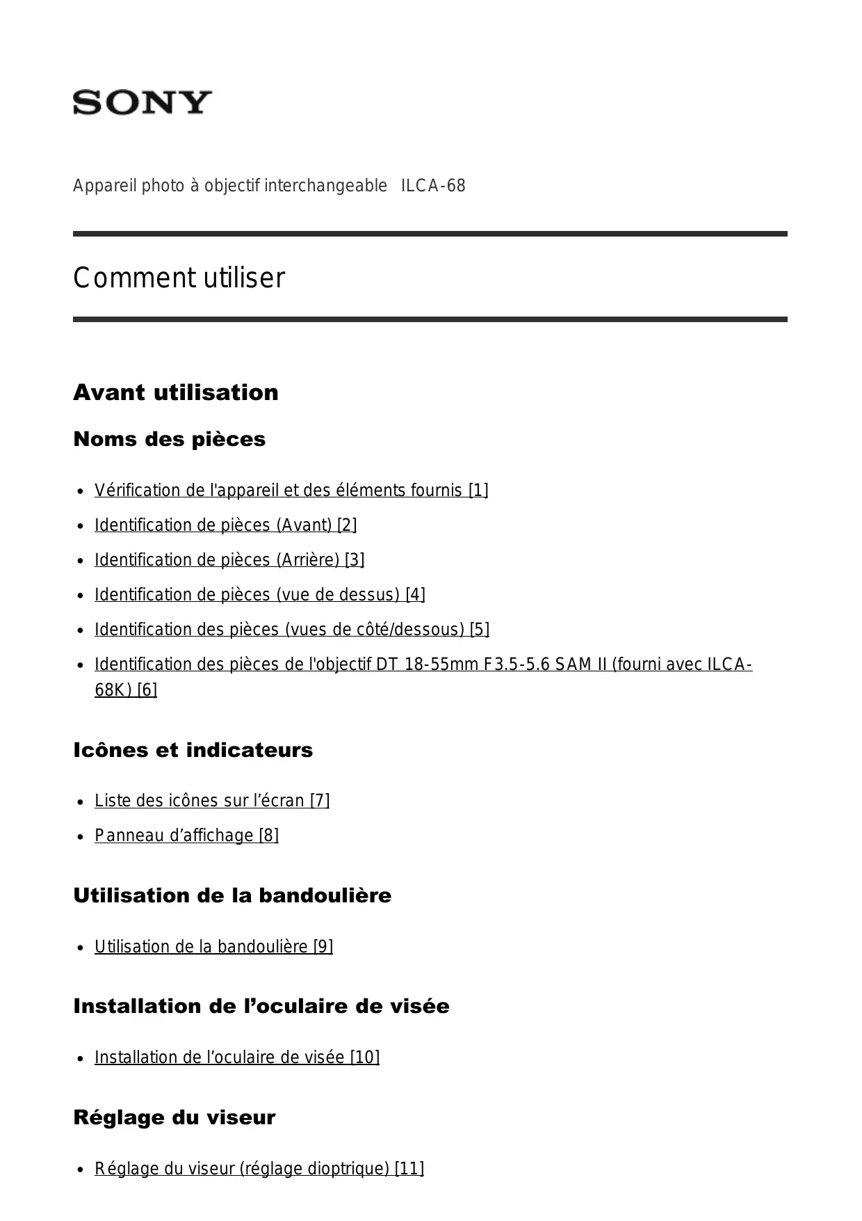 Appareil photo à objectif interchangeable ILCA-68 Comment utiliser Avant utilisation Noms des pièces Vérification de l'appareil et des éléments fournis [1] Identification de pièces (Avant) [2] Identification de pièces (Arrière) [3] Identification de pièces (vue de dessus) [4] Identification des pièces (vues de côté/dessous) [5] Identification des pièces de l'objectif DT 18-55mm F3.5-5.6 SAM II (fourni avec ILCA68K) [6] Icônes et indicateurs Liste des icônes sur l’écran [7] Panneau d’affichage [8] Utilisation de la bandoulière Utilisation de la bandoulière [9] Installation de l’oculaire de visée Installation de l’oculaire de visée [10] Réglage du viseur Réglage du viseur (réglage dioptrique) [11] Guide intégré à l’appareil À propos du [Guide intégr. à l'app.] [12] Préparation de l’appareil photo Charge de la batterie Charger la batterie au moyen du chargeur de batterie [13] Insérer la batterie dans l'appareil [14] Autonomie de la batterie et nombre d’images pouvant être enregistrées/lues en utilisant la batterie [15] Alimentation par une prise murale [16] Retrait de la batterie [17] Insertion d’une carte mémoire (vendue séparément) Insérer une carte mémoire [18] Retirer la carte mémoire [19] Fixation d’un objectif Installation de l’objectif [20] Retirer l’objectif [21] Remarques sur le changement d’objectif [22] Réglage de la date et heure Règle la date et l’heure [23] Vérification de la méthode d’utilisation Vérification de la méthode d’utilisation Utilisation de la molette de commande [24] Utilisation des éléments du MENU [25] Utilisation du bouton Fn (Fonction) [26] Utilisation de « Quick Navi » [27] Prise de vue Prise de vue d’images fixes/de films Prise d’images fixes [28] Enregistrement de films [29] Sélection d’un mode de prise de vue Liste des fonctions du sélecteur de mode [30] Auto intelligent [31] Automat. supérieur [32] Reconnaissance de scène [33] Les avantages de la prise de vue automatique [34] Programme Auto [35] Panor. par balayage [36] Sélection scène [37] Cont. télé-zoom AE [38] Priorité vitesse [39] Priorité ouvert. [40] Exposition manuelle [41] BULB [42] Rappel de mémoire [43] Film [44] Utilisation des fonctions de prise de vue Utilisation du zoom Zoom [45] Fonctions zoom du produit [46] Réglage du zoom [47] Facteur de zoom [48] Téléconvert. num. [49] Utilisation du flash Utilisation du flash [50] Mode Flash [51] Correct.flash [52] Verrouillage FEL [53] Commande flash [54] Puissance [55] Sélection d'un mode d’affichage à l’écran Changement d'affichage d’écran (Prise de vue) [56] Bouton DISP (Viseur) [57] Bouton DISP (Écran) [58] Sélection de la taille d'image fixe/qualité d'image Taille d'image (image fixe) [59] Ratio d'aspect (image fixe) [60] Qualité (image fixe) [61] Panorama : taille [62] Panorama : orient. [63] Réglage de la mise au point Changer la méthode de mise au point au moyen du commutateur de mode de mise au point [64] Zone mise au point [65] Verrouill. AF central [66] Désact. Aut. Zone AF [67] Points de Zone AF [68] Points spot flexible [69] Aff. Large Zone AF [70] Verrouillage de la mise au point [71] MaP manuelle [72] Loupe mise pt [73] Tmps gross. m. au p. [74] Niv. d'intensification [75] Couleur d'intensific. [76] Eye-Start AF (image fixe) [77] Illuminateur AF (image fixe) [78] Microréglage AF [79] AF par déclenc. (image fixe) [80] AF activé [81] AF sur les yeux [82] Vitesse AF (image fixe) [83] Sensibil. Suivi AF (image fixe) [84] Sensibil. Suivi AF (film) [85] Mesure de la distance exacte jusqu’au sujet [86] Contrôle de plage AF [87] Régl.priorité [88] Réglage de l'exposition Correct. exposition [89] Bouton de correction d'exposition [90] Mode de mesure [91] Verrouillage AE [92] AEL avec obturat. (image fixe) [93] Rég.corr.expo [94] Rayons diagon. [95] Guide param. expos. [96] Palier d'expo. [97] Sél./mol. comp. Ev [98] Sélection de l'entraînement (prise de vue en continu/retardateur) Entraînement [99] Prise d. v. en continu [100] Retardateur [101] Retardateur (Cont.) [102] Bracket continu [103] Bracket simple [104] Bracket.bal.B [105] Bracket DRO [106] Ordre Bracket. [107] Sélection de la sensibilité ISO ISO [108] RB multi-photos [109] Correction de la luminosité ou du contraste Opti Dyna (DRO) [110] HDR auto [111] Réglage des tonalités de couleur Bal. des blancs [112] Capturer la couleur blanche de base en mode [Réglage personnel] [113] Sélection d'un mode d'effet Effet de photo [114] Modes créatifs [115] Enregistrement de films Formats d’enregistrement de films [116] Format fichier (film) [117] Réglage d'enreg. (film) [118] SteadyShot (film) [119] Enregistrem. audio [120] Affich. niv. audio [121] Niveau d'enr. audio [122] Réduction bruit vent [123] Obt. vit. lente aut. (film) [124] Bouton MOVIE [125] Personnalisation des fonctions de prise de vue pour une utilisation pratique Mémoire [126] Réglages menu fnct. [127] Réglag. touche perso [128] Fonction du bouton de verrouillage de la mise au point [129] Fonction du bouton AEL [130] Fonction du bouton ISO [131] Fonction du bouton de correction d'exposition [132] Fonction du bouton WB [133] Fonction du bouton Mode d’entraînement [134] Fonction du bouton Aperçu [135] Fonction de la touche Personnalisée [136] Fonction de la touche centrale [137] Conf. sél./molette [138] Réglage des autres fonctions de ce produit Sourire/Dét. visage [139] Effet peau douce (image fixe) [140] Enregistrem. visage (Nouvel enregistrement) [141] Enregistrem. visage (Modification de l'ordre) [142] Enregistrem. visage (Supprimer) [143] Réd. yeux rouges [144] Cadrage automat. (image fixe) [145] SteadyShot (image fixe) [146] RB Pose longue (image fixe) [147] RB ISO élevée (image fixe) [148] Espace colorim. (image fixe) [149] Quadrillage [150] Affichage instantané [151] Affichage Live View [152] FINDER/MONITOR [153] Déc sans obj. [154] SteadyS. par décl. [155] e-Obt. à rid