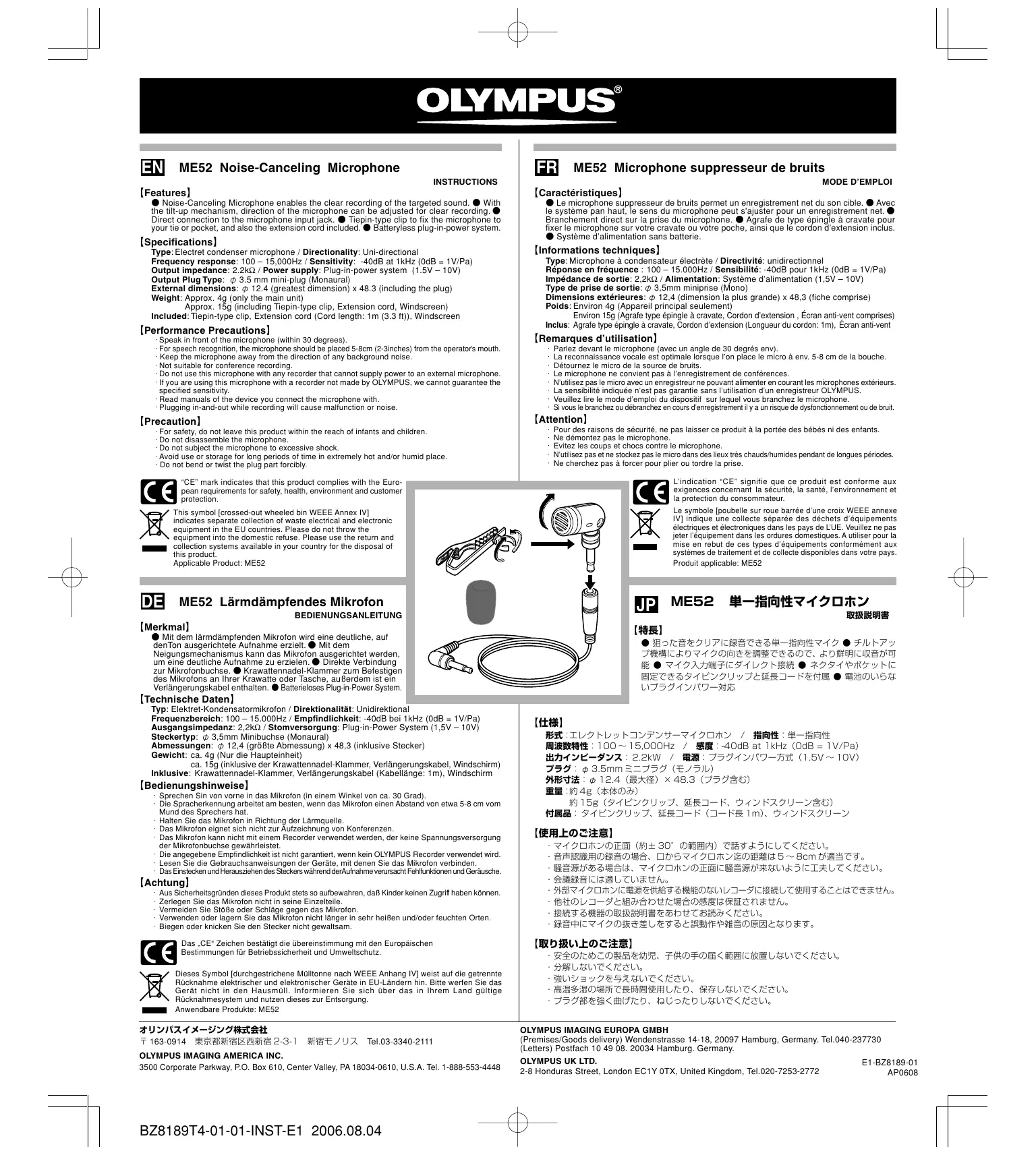 【Caractéristiques】 ● Noise-Canceling Microphone enables the clear recording of the targeted sound. ● With the tilt-up mechanism, direction of the microphone can be adjusted for clear recording. ● Direct connection to the microphone input jack. ● Tiepin-type clip to fix the microphone to your tie or pocket, and also the extension cord included. ● Batteryless plug-in-power system. 【Specifications】 Type: Electret condenser microphone / Directionality: Uni-directional Frequency response: 100 – 15,000Hz / Sensitivity: -40dB at 1kHz (0dB = 1V/Pa) Output impedance: 2.2kΩ / Power supply: Plug-in-power system (1.5V – 10V) Output Plug Type: φ 3.5 mm mini-plug (Monaural) External dimensions: φ 12.4 (greatest dimension) x 48.3 (including the plug) Weight: Approx. 4g (only the main unit) Approx. 15g (including Tiepin-type clip, Extension cord, Windscreen) Included: Tiepin-type clip, Extension cord (Cord length: 1m (3.3 ft)), Windscreen 【Performance Precautions】 ・Speak in front of the microphone (within 30 degrees). ・For speech recognition, the microphone should be placed 5-8cm (2-3inches) from the operator’s mouth. ・Keep the microphone away from the direction of any background noise. ・Not suitable for conference recording. ・Do not use this microphone with any recorder that cannot supply power to an external microphone. ・If you are using this microphone with a recorder not made by OLYMPUS, we cannot guarantee the specified sensitivity. ・Read manuals of the device you connect the microphone with. ・Plugging in-and-out while recording will cause malfunction or noise. ● Le microphone suppresseur de bruits permet un enregistrement net du son cible. ● Avec le système pan haut, le sens du microphone peut s'ajuster pour un enregistrement net. ● Branchement direct sur la prise du microphone. ● Agrafe de type épingle à cravate pour fixer le microphone sur votre cravate ou votre poche, ainsi que le cordon d’extension inclus. ● Système d’alimentation sans batterie. 【Informations techniques】 Type: Microphone à condensateur électrète / Directivité: unidirectionnel Réponse en fréquence : 100 – 15.000Hz / Sensibilité: -40dB pour 1kHz (0dB = 1V/Pa) Impédance de sortie: 2,2kΩ / Alimentation: Système d’alimentation (1,5V – 10V) Type de prise de sortie: φ 3,5mm miniprise (Mono) Dimensions extérieures: φ 12,4 (dimension la plus grande) x 48,3 (fiche comprise) Poids: Environ 4g (Appareil principal seulement) Environ 15g (Agrafe type épingle à cravate, Cordon d’extension , Écran anti-vent comprises) Inclus: Agrafe type épingle à cravate, Cordon d’extension (Longueur du cordon: 1m), Écran anti-vent 【Remarques d’utilisation】 ・ Parlez devant le microphone (avec un angle de 30 degrés env). ・ La reconnaissance vocale est optimale lorsque l’on place le micro à env. 5-8 cm de la bouche. ・ Détournez le micro de la source de bruits. ・ Le microphone ne convient pas à l’enregistrement de conférences. ・ N’utilisez pas le micro avec un enregistreur ne pouvant alimenter en courant les microphones extérieurs. ・ La sensibilité indiquée n’est pas garantie sans l’utilisation d’un enregistreur OLYMPUS. ・ Veuillez lire le mode d’emploi du dispositif sur lequel vous branchez le microphone. ・ Si vous le branchez ou débranchez en cours d’enregistrement il y a un risque de dysfonctionnement ou de bruit. 【Attention】 【Precaution】 ・For safety, do not leave this product within the reach of infants and children. ・Do not disassemble the microphone. ・Do not subject the microphone to excessive shock. ・Avoid use or storage for long periods of time in extremely hot and/or humid place. ・Do not bend or twist the plug part forcibly. ・ Pour des raisons de sécurité, ne pas laisser ce produit à la portée des bébés ni des enfants. ・ Ne démontez pas le microphone. ・ Evitez les coups et chocs contre le microphone. ・ N’utilisez pas et ne stockez pas le micro dans des lieux très chauds/humides pendant de longues périodes. ・ Ne cherchez pas à forcer pour plier ou tordre la prise. L’indication “CE” signifie que ce produit est conforme aux exigences concernant la sécurité, la santé, l’environnement et la protection du consommateur. “CE” mark indicates that this product complies with the European requirements for safety, health, environment and customer protection. Le symbole [poubelle sur roue barrée d’une croix WEEE annexe IV] indique une collecte séparée des déchets d’équipements électriques et électroniques dans les pays de L’UE. Veuillez ne pas jeter l’équipement dans les ordures domestiques. A utiliser pour la mise en rebut de ces types d’équipements conformément aux systèmes de traitement et de collecte disponibles dans votre pays. Produit applicable: ME52 This symbol [crossed-out wheeled bin WEEE Annex IV] indicates separate collection of waste electrical and electronic equipment in the EU countries. Please do not throw the equipment into the domestic refuse. Please use the return and collection systems available in your country for the disposal of this product. Applicable Product: ME52