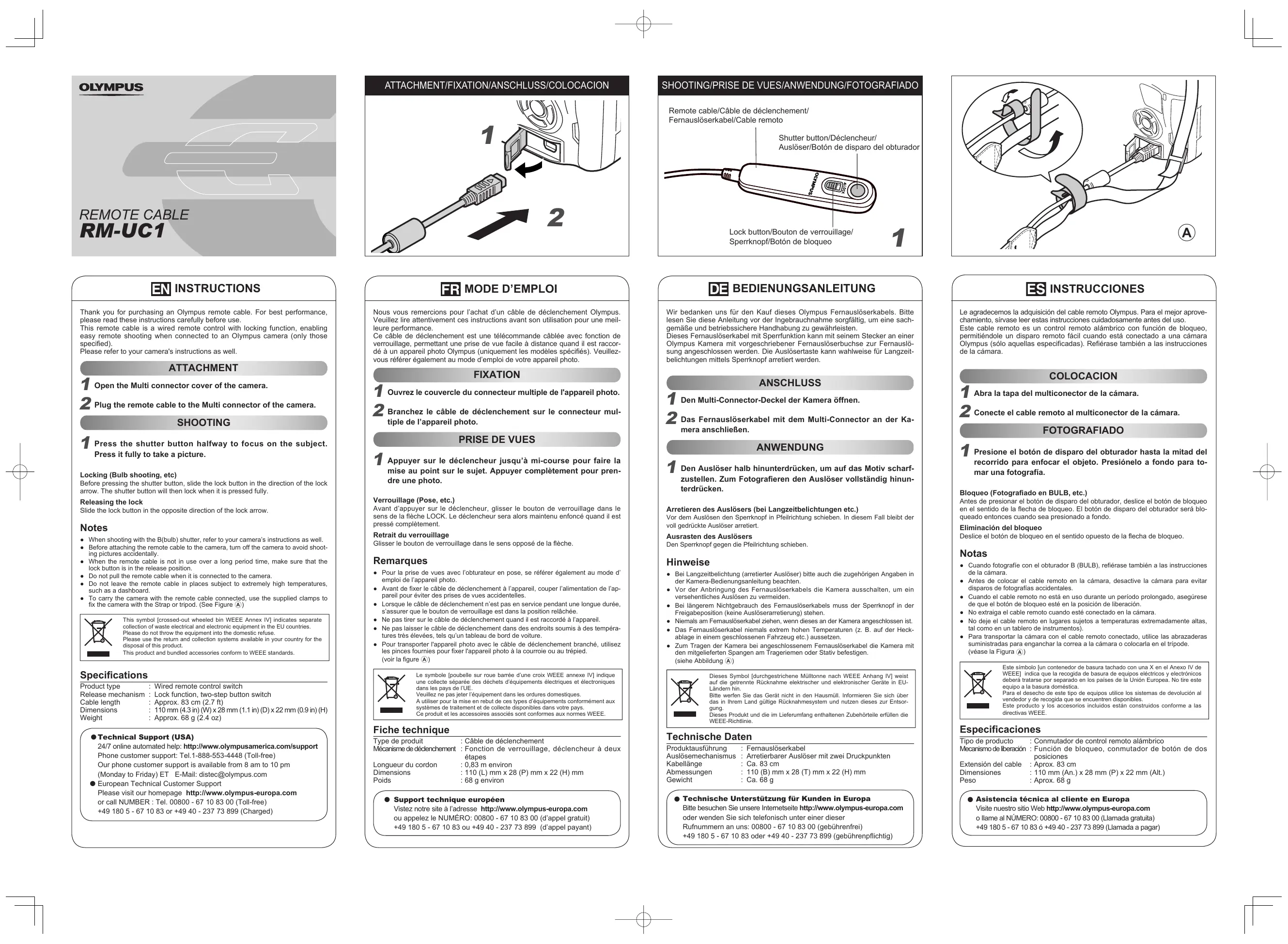 Appuyer sur le déclencheur jusqu’à mi-course pour faire la mise au point sur le sujet. Appuyer complètement pour prendre une photo. ANSCHLUSS 1 Den Multi-Connector-Deckel der Kamera öffnen. Das Fernauslöserkabel mit dem Multi-Connector an der Ka2 mera anschließen. ANWENDUNG Den Auslöser halb hinunterdrücken, um auf das Motiv scharf1 zustellen. Zum Fotografieren den Auslöser vollständig hinunterdrücken. Verrouillage (Pose, etc.) Avant d’appuyer sur le déclencheur, glisser le bouton de verrouillage dans le sens de la flèche LOCK. Le déclencheur sera alors maintenu enfoncé quand il est pressé complètement. Arretieren des Auslösers (bei Langzeitbelichtungen etc.) Retrait du verrouillage Glisser le bouton de verrouillage dans le sens opposé de la flèche. Ausrasten des Auslösers Remarques Hinweise ● Pour la prise de vues avec l’obturateur en pose, se référer également au mode d’ emploi de l’appareil photo. ● Avant de fixer le câble de déclenchement à l’appareil, couper l’alimentation de l’appareil pour éviter des prises de vues accidentelles. ● Lorsque le câble de déclenchement n’est pas en service pendant une longue durée, s’assurer que le bouton de verrouillage est dans la position relâchée. ● Ne pas tirer sur le câble de déclenchement quand il est raccordé à l’appareil. ● Ne pas laisser le câble de déclenchement dans des endroits soumis à des températures très élevées, tels qu’un tableau de bord de voiture. ● Pour transporter l'appareil photo avec le câble de déclenchement branché, utilisez les pinces fournies pour fixer l'appareil photo à la courroie ou au trépied. (voir la figure A) ● Bei Langzeitbelichtung (arretierter Auslöser) bitte auch die zugehörigen Angaben in der Kamera-Bedienungsanleitung beachten. ● Vor der Anbringung des Fernauslöserkabels die Kamera ausschalten, um ein versehentliches Auslösen zu vermeiden. ● Bei längerem Nichtgebrauch des Fernauslöserkabels muss der Sperrknopf in der Freigabeposition (keine Auslöserarretierung) stehen. ● Niemals am Fernauslöserkabel ziehen, wenn dieses an der Kamera angeschlossen ist. ● Das Fernauslöserkabel niemals extrem hohen Temperaturen (z. B. auf der Heckablage in einem geschlossenen Fahrzeug etc.) aussetzen. ● Zum Tragen der Kamera bei angeschlossenem Fernauslöserkabel die Kamera mit den mitgelieferten Spangen am Trageriemen oder Stativ befestigen. (siehe Abbildung A) Le symbole [poubelle sur roue barrée d’une croix WEEE annexe IV] indique une collecte séparée des déchets d’équipements électriques et électroniques dans les pays de l’UE. Veuillez ne pas jeter l’équipement dans les ordures domestiques. A utiliser pour la mise en rebut de ces types d’équipements conformément aux systèmes de traitement et de collecte disponibles dans votre pays. Ce produit et les accessoires associés sont conformes aux normes WEEE. Fiche technique Type de produit : Câble de déclenchement Mécanisme de déclenchement : Fonction de verrouillage, déclencheur à deux étapes Longueur du cordon : 0,83 m environ Dimensions : 110 (L) mm x 28 (P) mm x 22 (H) mm Poids : 68 g environ ● Support technique européen Vistez notre site à l’adresse http://www.olympus-europa.com ou appelez le NUMÉRO: 00800 - 67 10 83 00 (d’appel gratuit) +49 180 5 - 67 10 83 ou +49 40 - 237 73 899 (d’appel payant)