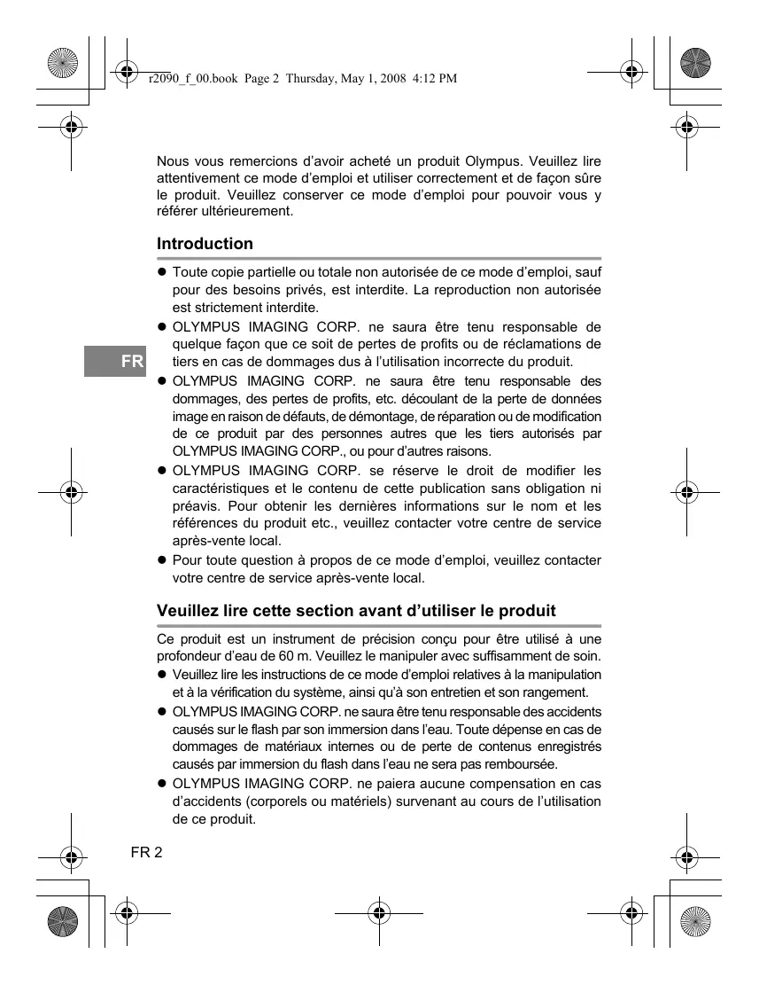 z Toute copie partielle ou totale non autorisée de ce mode d’emploi, sauf pour des besoins privés, est interdite. La reproduction non autorisée est strictement interdite. z OLYMPUS IMAGING CORP. ne saura être tenu responsable de quelque façon que ce soit de pertes de profits ou de réclamations de tiers en cas de dommages dus à l’utilisation incorrecte du produit. z OLYMPUS IMAGING CORP. ne saura être tenu responsable des dommages, des pertes de profits, etc. découlant de la perte de données image en raison de défauts, de démontage, de réparation ou de modification de ce produit par des personnes autres que les tiers autorisés par OLYMPUS IMAGING CORP., ou pour d’autres raisons. z OLYMPUS IMAGING CORP. se réserve le droit de modifier les caractéristiques et le contenu de cette publication sans obligation ni préavis. Pour obtenir les dernières informations sur le nom et les références du produit etc., veuillez contacter votre centre de service après-vente local. z Pour toute question à propos de ce mode d’emploi, veuillez contacter votre centre de service après-vente local. Veuillez lire cette section avant d’utiliser le produit Ce produit est un instrument de précision conçu pour être utilisé à une profondeur d’eau de 60 m. Veuillez le manipuler avec suffisamment de soin. z Veuillez lire les instructions de ce mode d’emploi relatives à la manipulation et à la vérification du système, ainsi qu’à son entretien et son rangement. z OLYMPUS IMAGING CORP. ne saura être tenu responsable des accidents causés sur le flash par son immersion dans l’eau. Toute dépense en cas de dommages de matériaux internes ou de perte de contenus enregistrés causés par immersion du flash dans l’eau ne sera pas remboursée. z OLYMPUS IMAGING CORP. ne paiera aucune compensation en cas d’accidents (corporels ou matériels) survenant au cours de l’utilisation de ce produit. FR 2 r2090_f_00.book Page 3 Thursday, May 1, 2008 4:12 PM