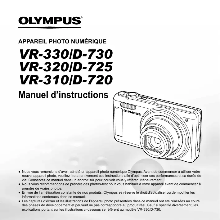 VR-330/D-730 VR-320/D-725 VR-310/D-720 Manuel d’instructions ● Nous vous remercions d’avoir acheté un appareil photo numérique Olympus. Avant de commencer à utiliser votre nouvel appareil photo, veuillez lire attentivement ces instructions afin d’optimiser ses performances et sa durée de vie. Conservez ce manuel dans un endroit sûr pour pouvoir vous y référer ultérieurement. ● Nous vous recommandons de prendre des photos-test pour vous habituer à votre appareil avant de commencer à prendre de vraies photos. ● En vue de l’amélioration constante de nos produits, Olympus se réserve le droit d’actualiser ou de modifier les informations contenues dans ce manuel. ● Les captures d’écran et les illustrations de l’appareil photo présentées dans ce manuel ont été réalisées au cours des phases de développement et peuvent ne pas correspondre au produit réel. Sauf si spécifié diversement, les explications portant sur les illustrations ci-dessous se réfèrent au modèle VR-330/D-730. Étape