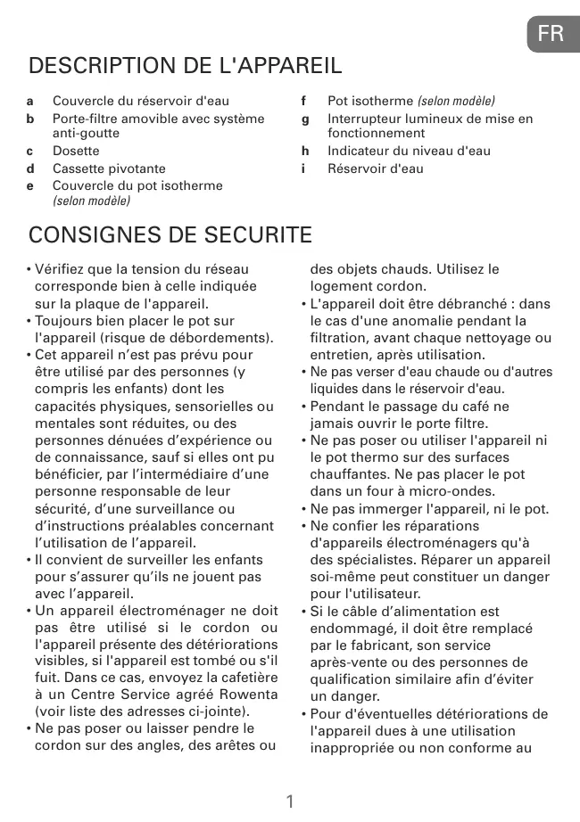 - Un appareil électroménager ne doit pas être utilisé si le cordon ou l'appareil présente des détériorations visibles, si l'appareil est tombé ou s'il fuit. Dans ce cas, envoyez la cafetière à un Centre Service agréé Rowenta (voir liste des adresses ci-jointe).