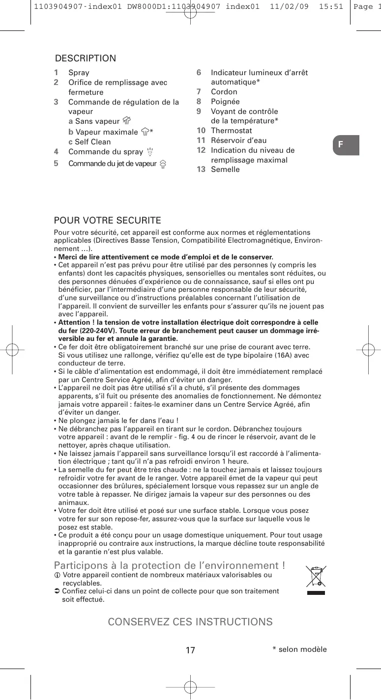 - selon modèle Page 1 1103904907-index01 DW8000D1:1103904907 index01 11/02/09 15:51 Branchez le fer et laissez-le chauffer de nouveau. Attendez l’évaporation de l’eau résiduelle. Débranchez l’appareil et laissez-le refroidir complètement. Lorsque la semelle est froide, essuyez-la avec un chiffon humide. CONSEILS Procédez à un auto-nettoyage SELF CLEAN environ toutes les 2 semaines. En cas d’une eau fortement calcaire, faites un nettoyage hebdomadaire. 15 • Nettoyez votre fer Essuyez l’appareil refroidi avec un chiffon ou avec une éponge humide. Eliminez les traces et les saletés sur la semelle avec un chiffon ou avec une éponge humide. IMPORTANT N’utilisez jamais de produits de nettoyage et d’objets tranchants ou abrasifs pour nettoyer la semelle et les autres parties de l’appareil. Si votre appareil est resté inutilisé pendant longtemps, utilisez la fonction SELF-CLEAN (voir § 14).