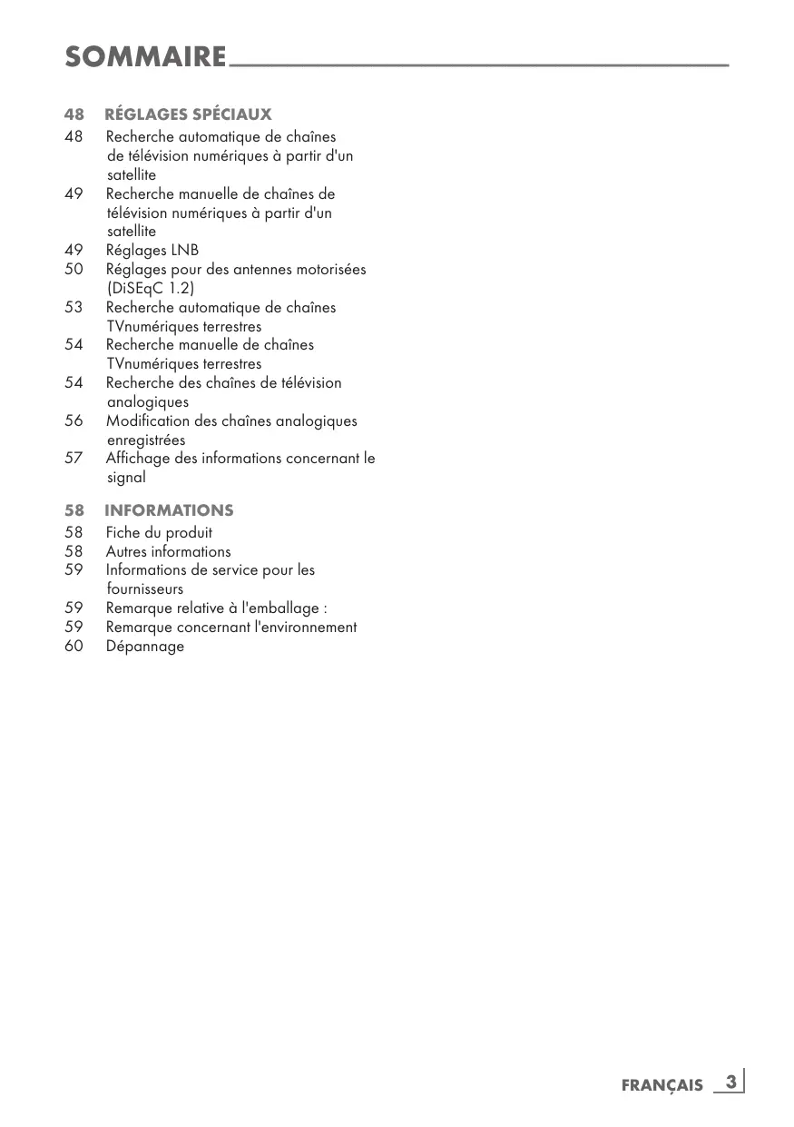 Recherche automatique de chaînes de télévision numériques à partir d'un satellite Recherche manuelle de chaînes de télévision numériques à partir d'un satellite Réglages LNB Réglages pour des antennes motorisées (DiSEqC 1.2) Recherche automatique de chaînes TVnumériques terrestres Recherche manuelle de chaînes TVnumériques terrestres Recherche des chaînes de télévision analogiques Modification des chaînes analogiques enregistrées Affichage des informations concernant le signal INFORMATIONS Fiche du produit Autres informations Informations de service pour les fournisseurs Remarque relative à l'emballage : Remarque concernant l'environnement Dépannage FRANÇAIS