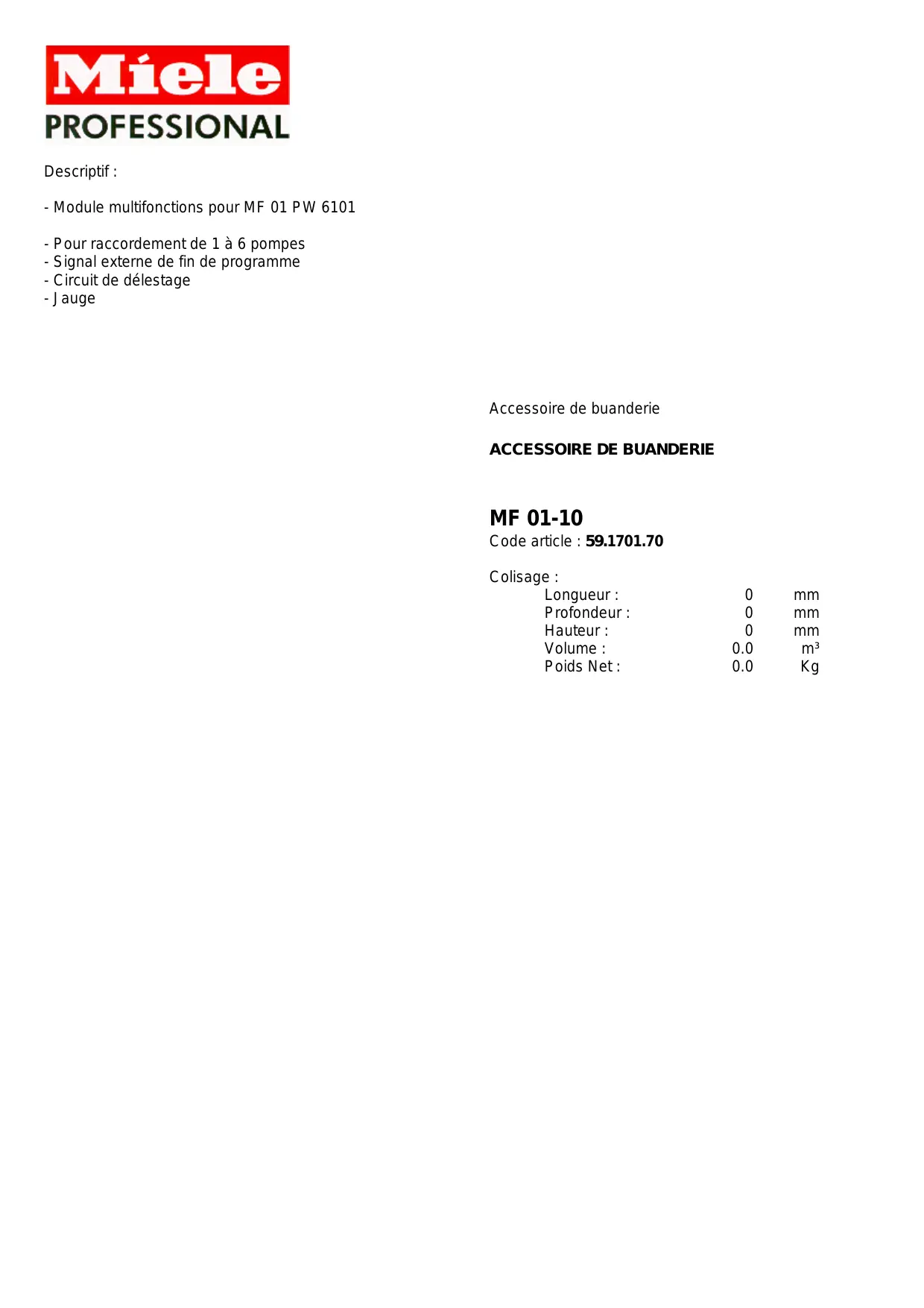 MF 01-10 Code article : 59.1701.70 Colisage : Longueur : Profondeur : Hauteur : Volume : Poids Net :