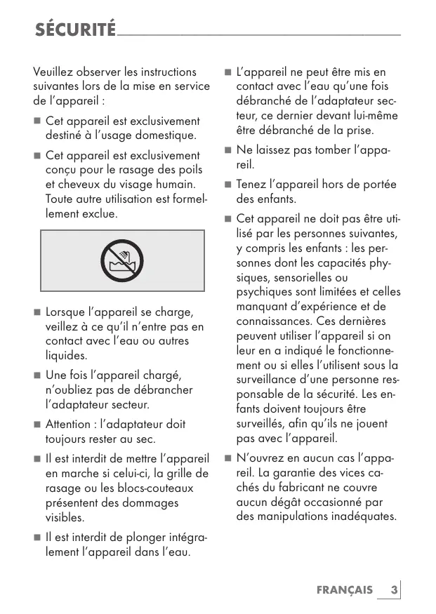 Cet apparéil est exclusivement concu pour le rasage des poils et cheveux du visage humain. Toute autre utilisation est formellement exclue.