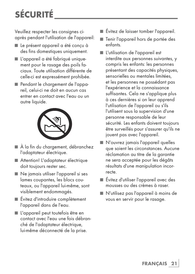 - Pendant le chargement de l'appareil, celui-ci ne doit enaucun cas entrere n contact avec I'eau ou un autre liquide.