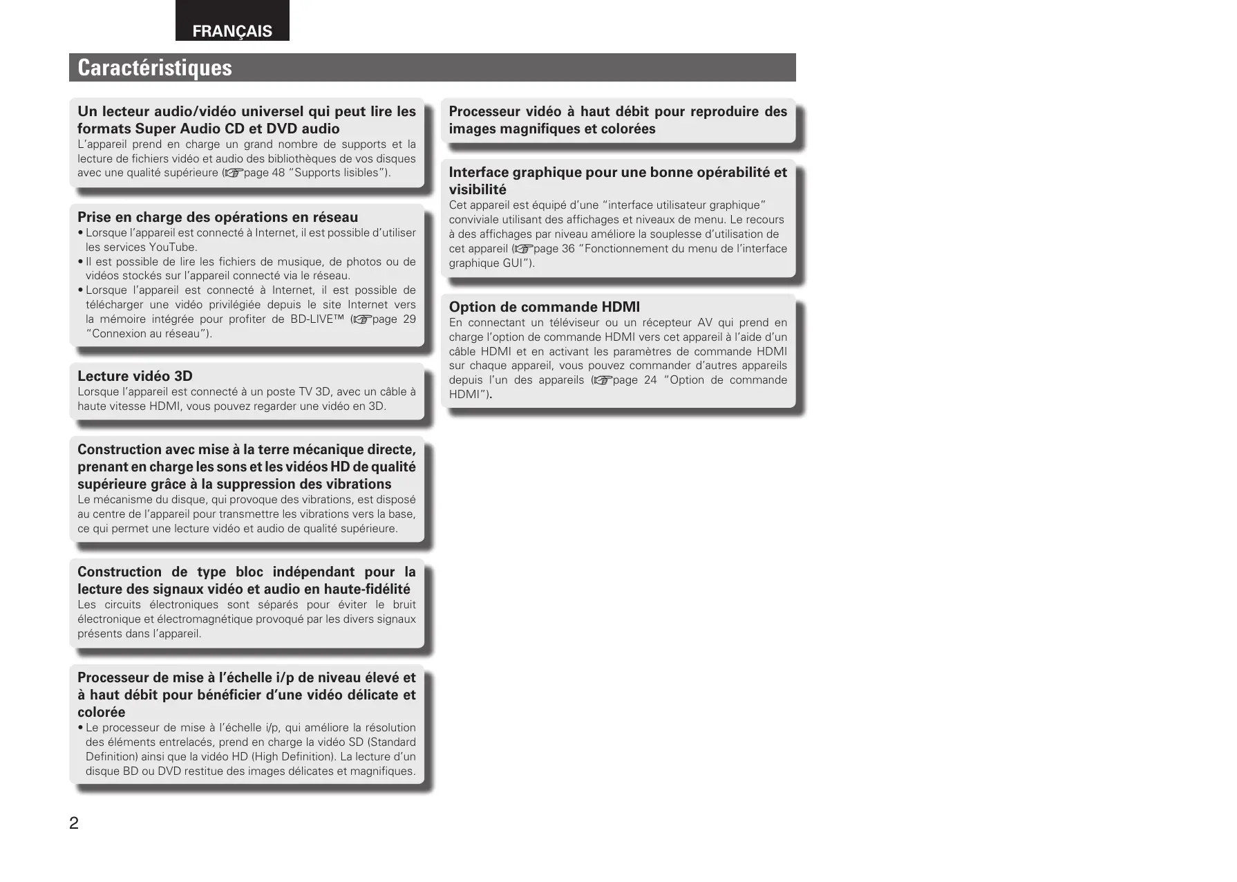 Processeur vidéo à haut débit pour reproduire des images magnifiques et colorées Interface graphique pour une bonne opérabilité et visibilité Cet appareil est équipé d’une “interface utilisateur graphique” conviviale utilisant des affichages et niveaux de menu. Le recours à des affichages par niveau améliore la souplesse d’utilisation de cet appareil (vpage 36 “Fonctionnement du menu de l’interface graphique GUI”). Option de commande HDMI En connectant un téléviseur ou un récepteur AV qui prend en charge l’option de commande HDMI vers cet appareil à l’aide d’un câble HDMI et en activant les paramètres de commande HDMI sur chaque appareil, vous pouvez commander d’autres appareils depuis l’un des appareils (vpage 24 “Option de commande HDMI”). FRANÇAIS Précautions relatives à la manipulation d’une vidéo 3D