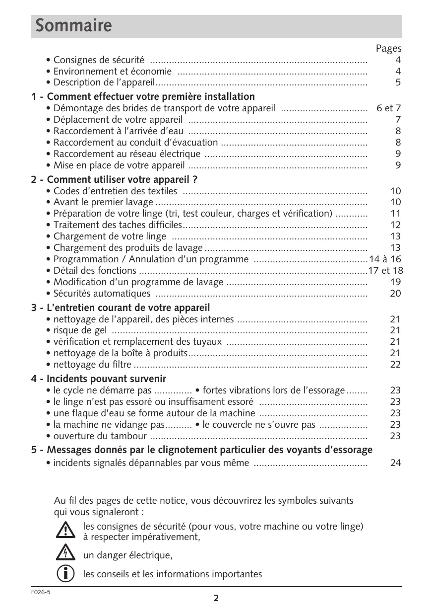 2 - Comment utiliser votre appareil ? • Codes d’entretien des textiles 10 • Avant le premier lavage 10 • Préparation de votre linge (tri, test couleur, charges et vérification) 11 • Traitement des taches difficiles 12 • Chargement de votre linge 13 • Chargement des produits de lavage 13 • Programmation / Annulation d’un programme 14 à 16 • Détail des fonctions 17 et 18 • Modification d’un programme de lavage 19 • Sécurités automatiques 20