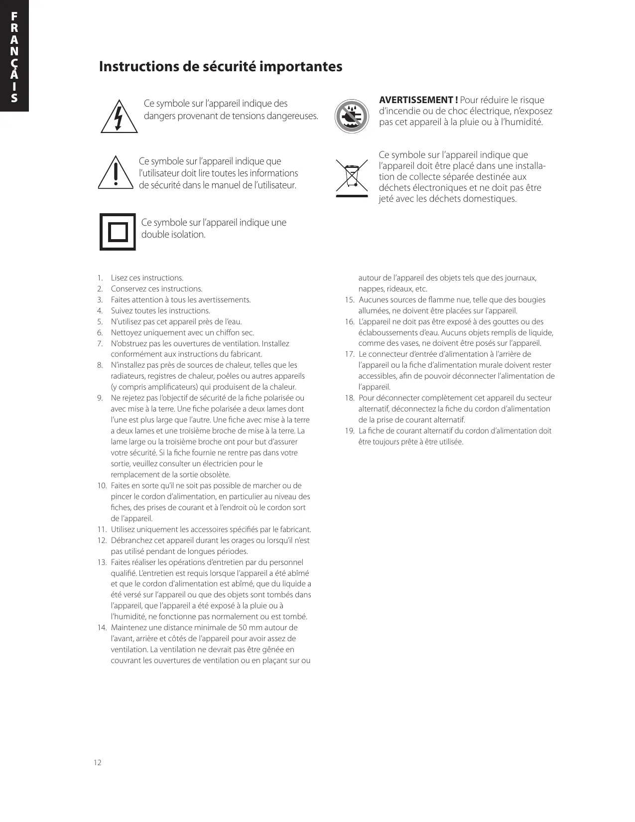 Conservez ces instructions. Faites attention à tous les avertissements. Suivez toutes les instructions. N’utilisez pas cet appareil près de l’eau. Nettoyez uniquement avec un chiffon sec. N’obstruez pas les ouvertures de ventilation. Installez conformément aux instructions du fabricant. N’installez pas près de sources de chaleur, telles que les radiateurs, registres de chaleur, poêles ou autres appareils (y compris amplificateurs) qui produisent de la chaleur. Ne rejetez pas l’objectif de sécurité de la fiche polarisée ou avec mise à la terre. Une fiche polarisée a deux lames dont l’une est plus large que l’autre. Une fiche avec mise à la terre a deux lames et une troisième broche de mise à la terre. La lame large ou la troisième broche ont pour but d’assurer votre sécurité. Si la fiche fournie ne rentre pas dans votre sortie, veuillez consulter un électricien pour le remplacement de la sortie obsolète. Faites en sorte qu’il ne soit pas possible de marcher ou de pincer le cordon d’alimentation, en particulier au niveau des fiches, des prises de courant et à l’endroit où le cordon sort de l’appareil. Utilisez uniquement les accessoires spécifiés par le fabricant. Débranchez cet appareil durant les orages ou lorsqu’il n’est pas utilisé pendant de longues périodes. Faites réaliser les opérations d’entretien par du personnel qualifié. L’entretien est requis lorsque l’appareil a été abîmé et que le cordon d’alimentation est abîmé, que du liquide a été versé sur l’appareil ou que des objets sont tombés dans l’appareil, que l’appareil a été exposé à la pluie ou à l’humidité, ne fonctionne pas normalement ou est tombé. Maintenez une distance minimale de 50 mm autour de l’avant, arrière et côtés de l’appareil pour avoir assez de ventilation. La ventilation ne devrait pas être gênée en couvrant les ouvertures de ventilation ou en plaçant sur ou