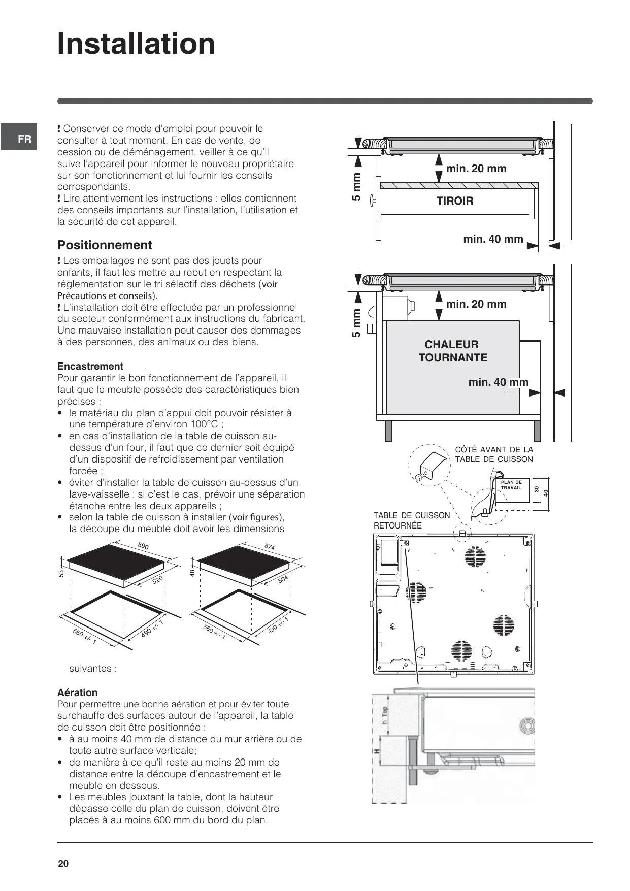 • à au moins 40 mm de distance du mur arrière ou de toute autre surface verticale; • de manière à ce qu’il reste au moins 20 mm de distance entre la découpe d’encastrement et le meuble en dessous. • Les meubles jouxtant la table, dont la hauteur dépasse celle du plan de cuisson, doivent être placés à au moins 600 mm du bord du plan.
