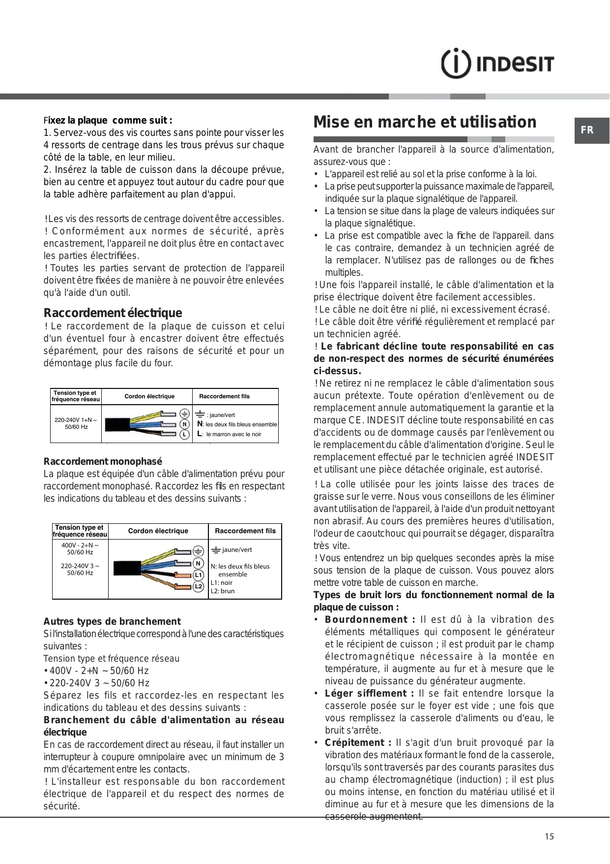 - La prise est compatible avec la fiche de l'appareil. dans le cas contraire, demandez à un technicien agréé de la remplacer. N'utilisez pas de rallonges ou de fiches multiples. ! Une fois l'appareil installé, le câble d'alimentation et la prise électrique doivent être facilement accessibles. ! Le câble ne doit être ni plié, ni excessivement écrasé. ! Le câble doit être vérifié régulièrement et remplacé par un technicien agréé. ! Le fabricant décline toute responsabilité en cas de non-respect des normes de sécurité énumérées ci-dessus. ! Ne retirez ni ne remplacez le câble d'alimentation sous aucun prétexte. Toute opération d'enlèvement ou de remplacement annule automatiquement la garantie et la marque CE. INDESIT décline toute responsabilité en cas d'accidents ou de dommage causés par l'enlèvement ou le remplacement du câble d'alimentation d'origine. Seul le remplacement effectué par le technicien agréé INDESIT et utilisant une pièce détachée originale, est autorisé. ! La colle utilisée pour les joints laisse des traces de graisse sur le verre. Nous vous conseillons de les éliminer avant utilisation de l'appareil, à l'aide d'un produit nettoyant non abrasif. Au cours des premières heures d'utilisation, l'odeur de caoutchouc qui pourrait se dégager, disparaîtra très vite. ! Vous entendrez un bip quelques secondes après la mise sous tension de la plaque de cuisson. Vous pouvez alors mettre votre table de cuisson en marche. Types de bruit lors du fonctionnement normal de la plaque de cuisson :