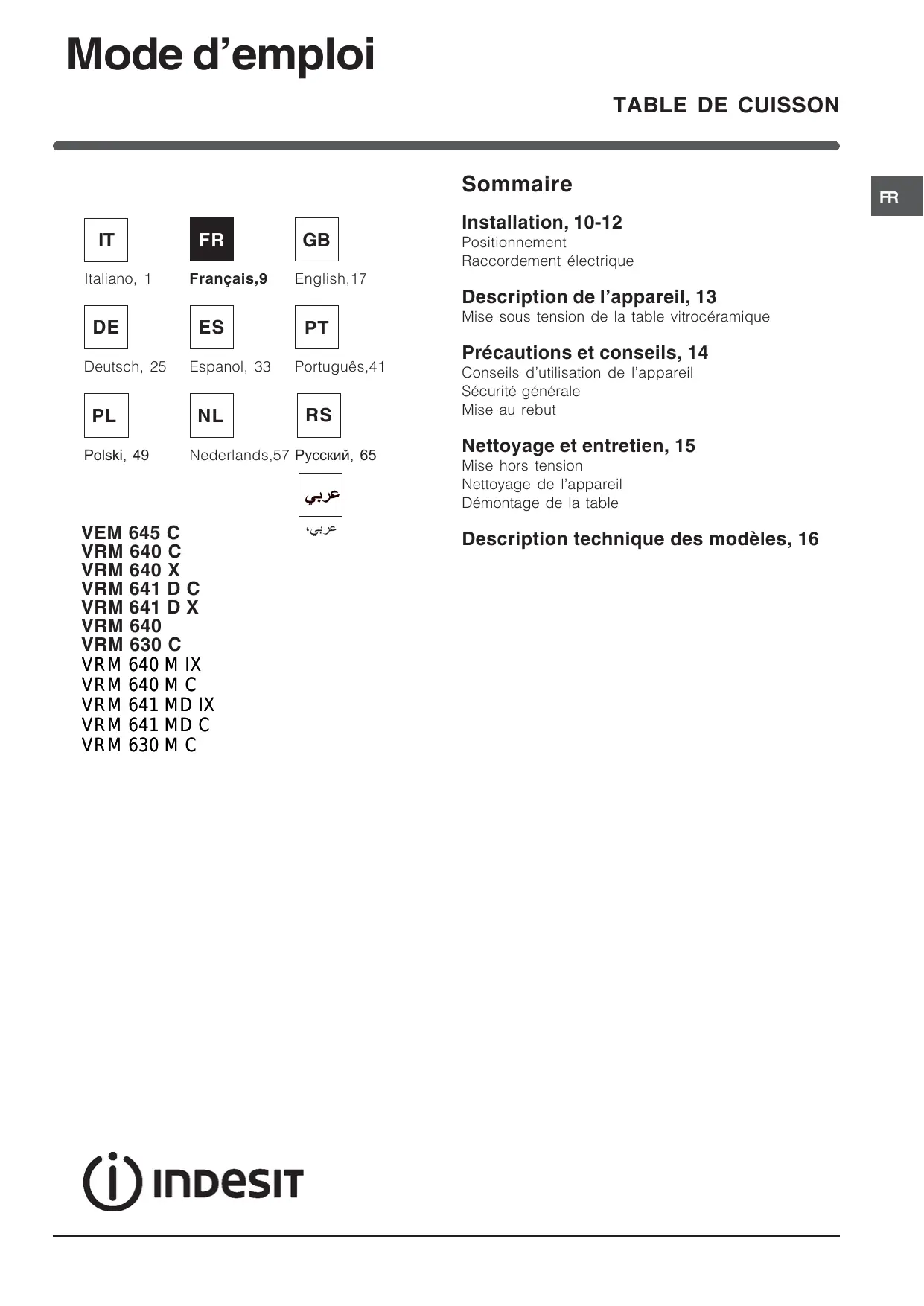 Retrouvez gratuitement la notice de l'appareil VRM641MDC INDESIT au format PDF.
