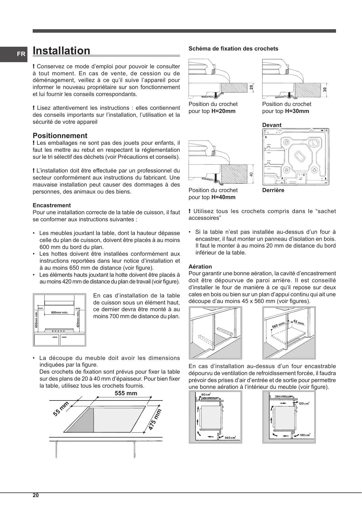 Aération Pour garantir une bonne aération, la cavité d’encastrement doit être dépourvue de paroi arrière. Il est conseillé d’installer le four de manière à ce qu’il repose sur deux cales en bois ou bien sur un plan d’appui continu qui ait une découpe d’au moins 45 x 560 mm (voir figures).