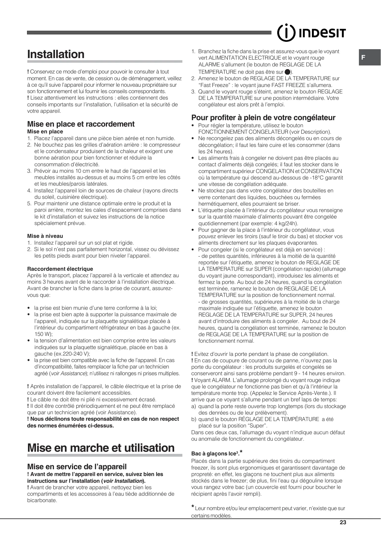 FONCTIONNEMENT CONGELATEUR (voir Description). • Ne recongelez pas des aliments décongelés ou en cours de décongélation; il faut les faire cuire et les consommer (dans les 24 heures). • Les aliments frais à congeler ne doivent pas être placés au contact d’aliments déjà congelés; il faut les stocker dans le compartiment supérieur CONGELATION et CONSERVATION où la température qui descend au-dessous de -18°C garantit une vitesse de congélation adéquate. • Ne stockez pas dans votre congélateur des bouteilles en verre contenant des liquides, bouchées ou fermées hermétiquement, elles pourraient se briser. • L’étiquette placée à l’intérieur du congélateur vous renseigne sur la quantité maximale d’aliments pouvant être congelée quotidiennement (par exemple: 4 kg/24h). • Pour gagner de la place à l’intérieur du congélateur, vous pouvez enlever les tiroirs (sauf le tiroir du bas) et stocker vos aliments directement sur les plaques évaporantes. • Pour congeler (si le congélateur est déjà en service) : - de petites quantités, inférieures à la moitié de la quantité reportée sur l’étiquette, amenez le bouton de REGLAGE DE LA TEMPERATURE sur SUPER (congélation rapide) (allumage du voyant jaune correspondant), introduisez les aliments et fermez la porte. Au bout de 24 heures, quand la congélation est terminée, ramenez le bouton de REGLAGE DE LA TEMPERATURE sur la position de fonctionnement normal. - de grosses quantités, supérieures à la moitié de la charge maximale indiquée sur l’étiquette, amenez le bouton REGLAGE DE LA TEMPERATURE sur SUPER, 24 heures avant d’introduire des aliments à congeler. Au bout de 24 heures, quand la congélation est terminée, ramenez le bouton de REGLAGE DE LA TEMPERATURE sur la position de fonctionnement normal. ! Evitez d’ouvrir la porte pendant la phase de congélation. ! En cas de coupure de courant ou de panne, n’ouvrez pas la porte du congélateur : les produits surgelés et congelés se conserveront ainsi sans problème pendant 9 - 14 heures environ. ! Voyant ALARM. L’allumage prolongé du voyant rouge indique que le congélateur ne fonctionne pas bien et qu’à l’intérieur la température monte trop. (Appelez le Service Après-Vente.). Il arrive que ce voyant s’allume pendant un bref laps de temps: a) quand la porte reste ouverte trop longtemps (lors du stockage des denrées ou de leur prélèvement). b) quand le bouton RÉGLAGE DE LA TEMPÉRATURE a été placé sur la position “Super”. Dans ces deux cas, l’allumage du voyant n’indique aucun défaut ou anomalie de fonctionnement du congélateur. Bac à glaçons Ice3.* Placés dans la partie supérieure des tiroirs du compartiment freezer, ils sont plus ergonomiques et garantissent davantage de propreté: en effet, les glaçons ne touchent plus aux aliments stockés dans le freezer; de plus, fini l'eau qui dégouline lorsque vous rangez votre bac (un couvercle est fourni pour boucher le récipient après l'avoir rempli).