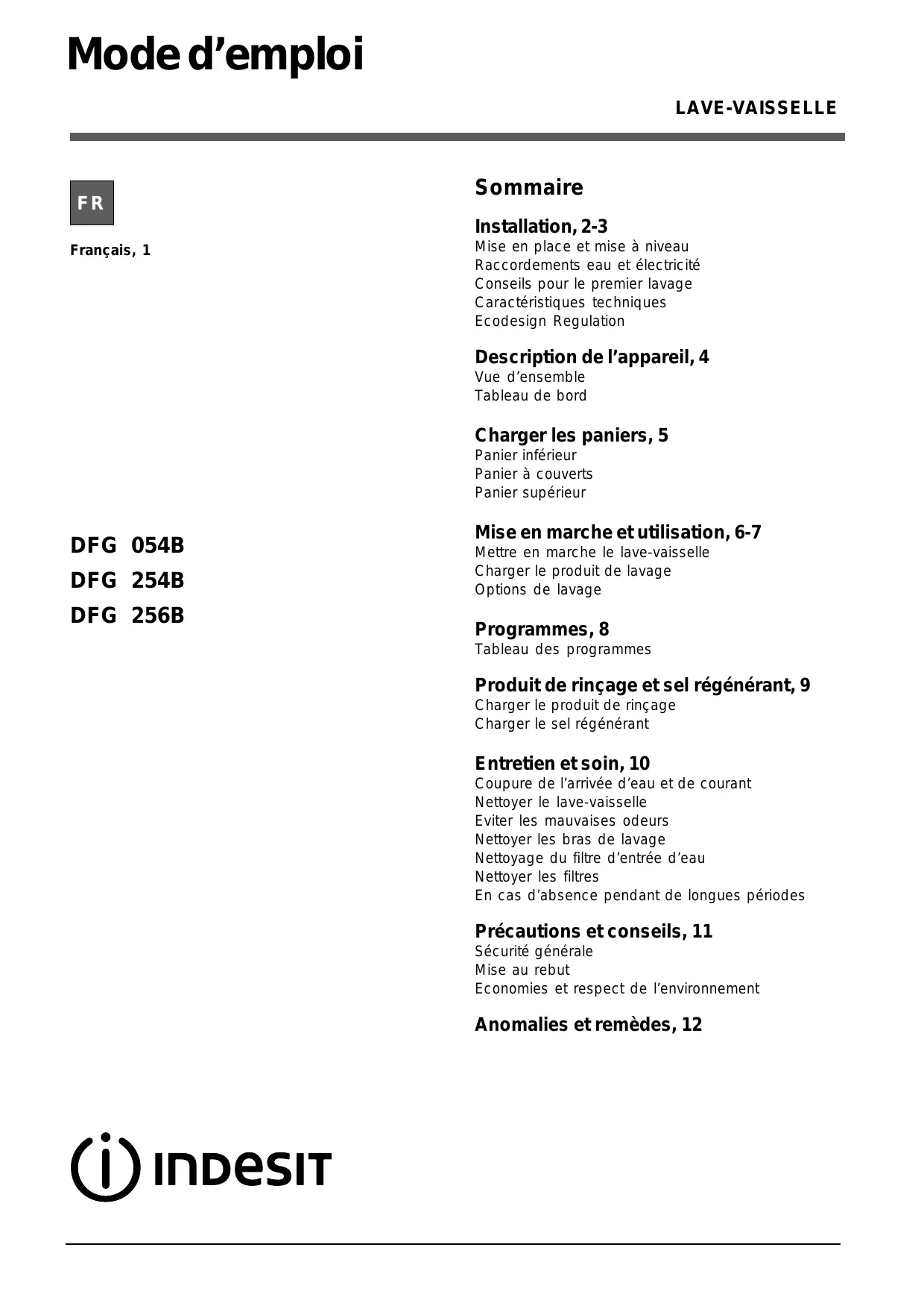 DFG 254B FR - Lave-vaisselle INDESIT - Notice d'utilisation et mode d'emploi gratuit