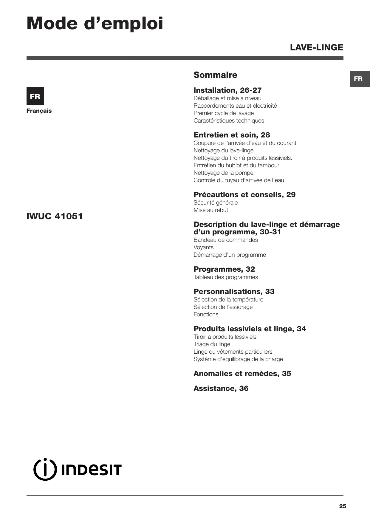 IWUC 41051C - Lave-linge INDESIT - Notice d'utilisation et mode d'emploi gratuit