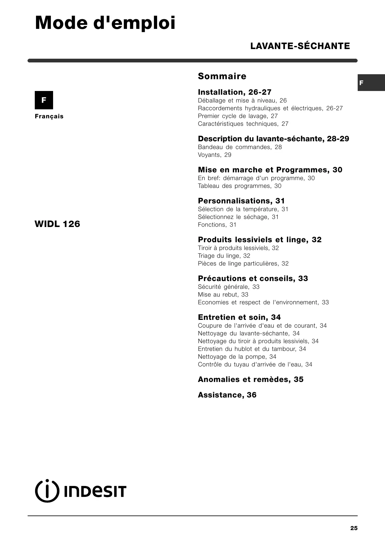 Retrouvez gratuitement la notice de l'appareil WIDL 126 INDESIT au format PDF.