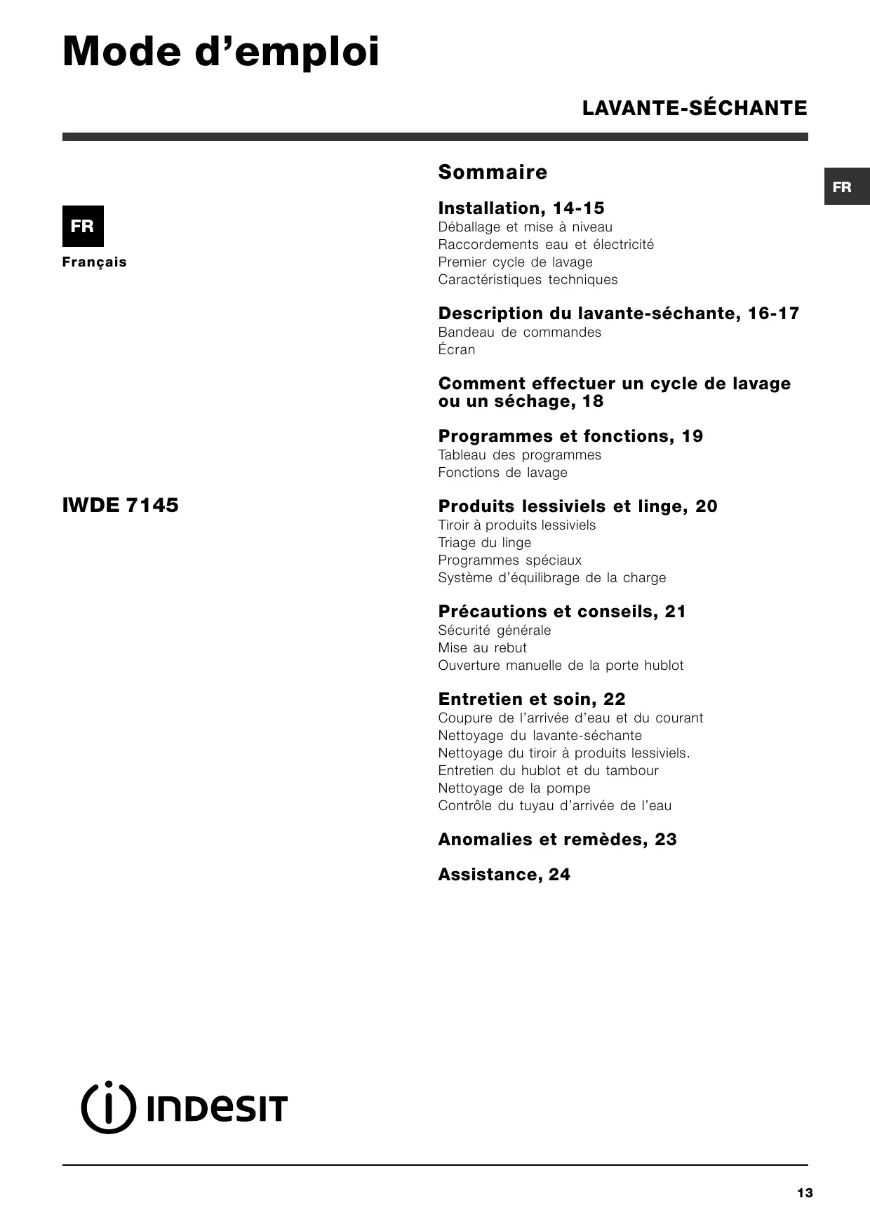 IWDE 7145 B - Lave-linge séchant INDESIT - Notice d'utilisation et mode d'emploi gratuit