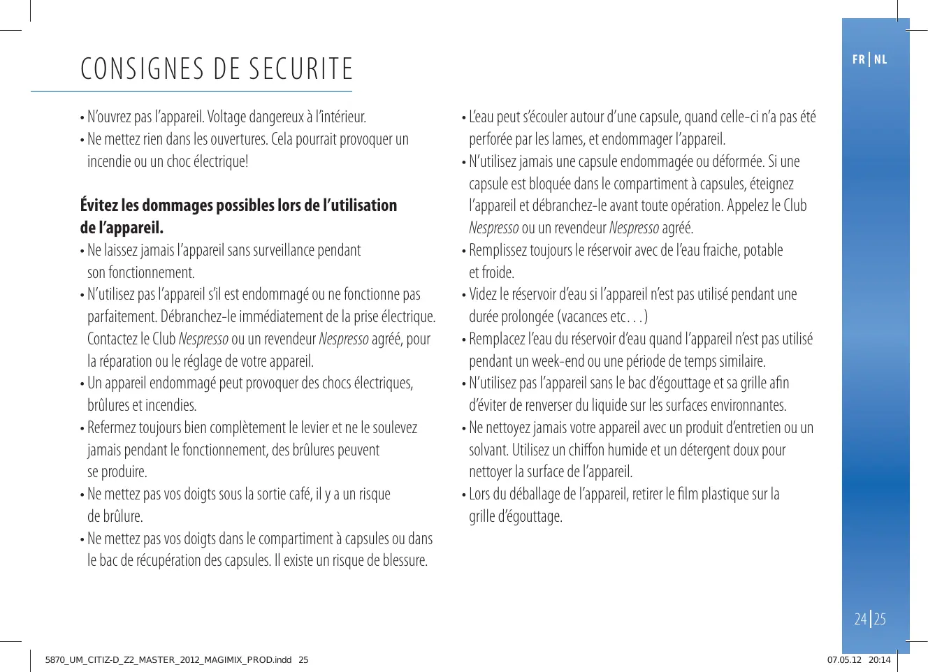 FR NL AVERTISSEMENT: les consignes de sécurité font partie de l’appareil. Veuillez les lire attentivement avant d’utiliser votre nouvel appareil. Gardez-les dans un endroit où vous pourrez les retrouver et vous y référer ultèrieurement. AVERTISSEMENT: lorsque ce symbole apparaît, veuillez consulter les mesures de sécurité pour éviter d’éventuels dangers et dommages. INFORMATION: lorsque ce symbole apparaît, veuillez r-FTFOGBOUT ÄHÊTEFBOTFUQMVT FUMFTQFSTPOOFTRVJOF QPTTÍEFOUQBTMFYQÊSJFODFFUMFTDPOOBJTTBODFTOÊDFTTBJSFTPVEPOU prendre connaissance du conseil pour une utilisation les aptitudes physiques, sensorielles ou mentales sont réduites sûre et conforme de votre appareil. EPJWFOUËUSFTVQFSWJTÊTMPSTEFMPQÊSBUJPOEFMBQQBSFJMBñOEF r-BQQBSFJMFTUDPOÉVQPVSQSÊQBSFSEFTCPJTTPOTDPOGPSNÊNFOUÆ MVUJMJTFSEFNBOJÍSFTÊDVSJUBJSFFUEFDPNQSFOESFMFTEBOHFST ces instructions. QPUFOUJFMT-FTFOGBOUTOFEPJWFOUQBTKPVFSBWFDMBQQBSFJM6O r/VUJMJTF[QBTMBQQBSFJMQPVSEBVUSFTVTBHFTRVFDFVYQSÊWVT FOGBOUOFEFWSBJUQBTOFUUPZFSMBQQBSFJMPVFíFDUVFSVOFPQÊSBUJPO r$FUBQQBSFJMBÊUÊDPOÉVTFVMFNFOUQPVSVOVTBHFJOUÊSJFVS QPVSVO EFOUSFUJFOTBOTTVQFSWJTJPO usage dans des conditions de températures non extrêmes. r-FTFOGBOUTEPJWFOUËUSFTVQFSWJTÊTBñOEFTBTTVSFSRVJMTOFKPVFOU rProtégez votre appareil des effets directs des rayons du soleil, des QBTBWFDMBQQBSFJM ÊDMBCPVTTVSFTEFBVFUEFMIVNJEJUÊ rCet appareil est prévu seulement pour une utilisation domestique et r-FGBCSJDBOUEÊDMJOFUPVUFSFTQPOTBCJMJUÊFUMBHBSBOUJFOF des utilisations similaires comme: les espaces cuisine dans les ma TBQQMJRVFSBQBTFODBTEVTBHFDPNNFSDJBM EVUJMJTBUJPOTPVEF gasins, les bureaux ou autres environnements de travail, les fermes; NBOJQVMBUJPOTJOBQQSPQSJÊFT EFEPNNBHFTSÊTVMUBOUEVOVTBHF VOFVUJMJTBUJPOQBSMFTDMJFOUTEBOTMFTIÔUFMT MFTDIBNCSFTEIÔUFTFU JODPSSFDU EVOGPODUJPOOFNFOUFSSPOÊ EVOFSÊQBSBUJPOQBSVOOPO professionnel ou du non respect des instructions. autres environnements résidentiels ou du type bed&breakfast. 22 23 5870_UM_CITIZ-D_Z2_MASTER_2012_MAGIMIX_PROD.indd 23