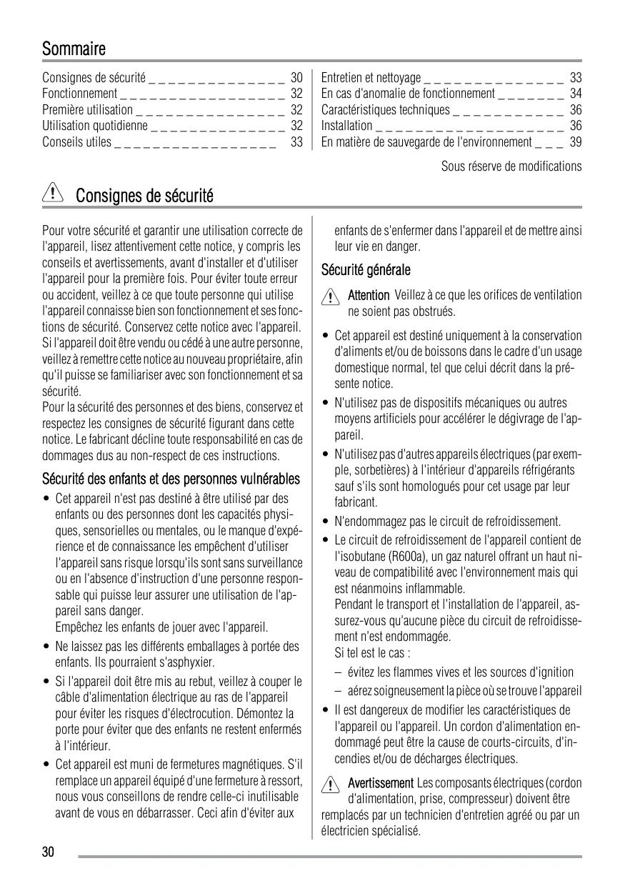 Sécurité générale Attention Veillez à ce que les orifices de ventilation ne soient pas obstrués. • Cet appareil est destiné uniquement à la conservation d'aliments et/ou de boissons dans le cadre d'un usage domestique normal, tel que celui décrit dans la présente notice. • N'utilisez pas de dispositifs mécaniques ou autres moyens artificiels pour accélérer le dégivrage de l'appareil. • N'utilisez pas d'autres appareils électriques (par exemple, sorbetières) à l'intérieur d'appareils réfrigérants sauf s'ils sont homologués pour cet usage par leur fabricant. • N'endommagez pas le circuit de refroidissement. • Le circuit de refroidissement de l'appareil contient de l'isobutane (R600a), un gaz naturel offrant un haut niveau de compatibilité avec l'environnement mais qui est néanmoins inflammable. Pendant le transport et l'installation de l'appareil, assurez-vous qu'aucune pièce du circuit de refroidissement n'est endommagée. Si tel est le cas : – évitez les flammes vives et les sources d'ignition – aérez soigneusement la pièce où se trouve l'appareil • Il est dangereux de modifier les caractéristiques de l'appareil ou l'appareil. Un cordon d'alimentation endommagé peut être la cause de courts-circuits, d'incendies et/ou de décharges électriques. Avertissement Les composants électriques (cordon d'alimentation, prise, compresseur) doivent être remplacés par un technicien d'entretien agréé ou par un électricien spécialisé.