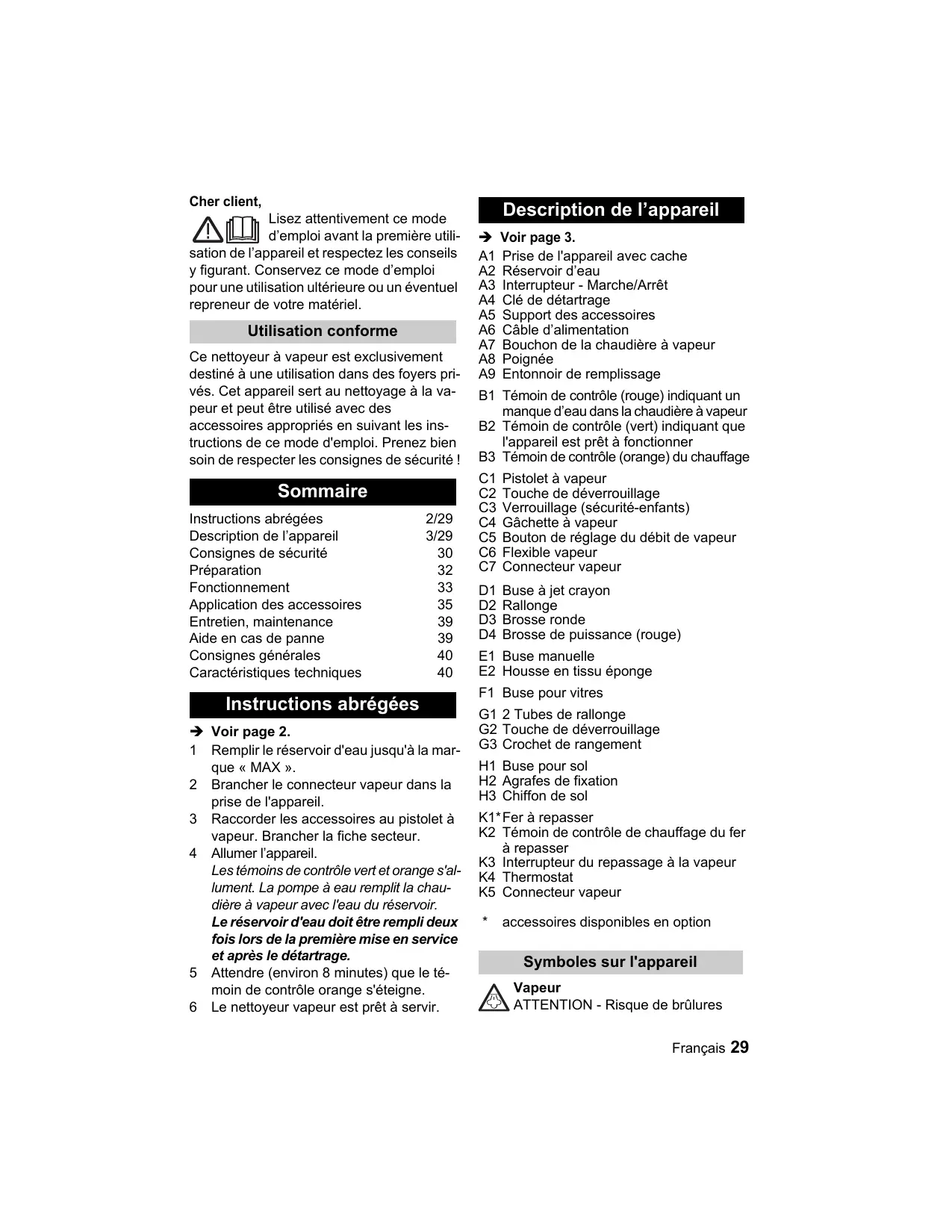 Lisez attentivement ce mode d'emploi avant la première utili- sation de l'appareil et respectez les conseils y figurant. Conservez ce mode d'emploi pour une utilisation ultérieure ou un éventuel repreneur de votre matériel. Utilisation conforme Ce nettoyeur à vapeur est exclusivement destiné à une utilisation dans des foyers pri- vés. Cet appareil sert au nettoyage à la va- peur et peut être utilisé avec des accessoires appropriés en suivant les ins- tructions de ce mode d'emploi. Prenez bien soin de respecter les consignes de sécurité ! Instructions abrégées 2/29 Description de l'appareil 3/29 Consignes de sécurité 30 Préparation 32 Fonctionnement 33 Application des accessoires 35 Entretien, maintenance 39 Aide en cas de panne 39 Consignes générales 40 Caractéristiques techniques 40 Instructions abrégées > Voir page 2. 1 Remplir le réservoir d'eau jusqu'à la mar- que « MAX ». 2 Brancher le connecteur vapeur dans la prise de l'appareil. 3 Raccorder les accessoires au pistolet à vapeur. Brancher la fiche secteur. 4 Allumer l'appareil. Les témoins de contrôle vert et orange s'al- lument. La pompe à eau remplit la chau- dière à vapeur avec l'eau du réservoir. Le réservoir d'eau doit être rempli deux fois lors de la première mise en service et après le détartrage. 5 Attendre (environ 8 minutes) que le té- moin de contrôle orange s'éteigne. 6 Le nettoyeur vapeur est prêt à servir. Description de l'appareil > Voir page 3. A1 Prise de l'appareil avec cache A2 Réservoir d'eau A3 Interrupteur - Marche/Arrêt A4 Clé de détartrage A5 Support des accessoires A6 Câble d'alimentation A7 Bouchon de la chaudière à vapeur A8 Poignée A9 Entonnoir de remplissage B1 Témoin de contrôle (rouge) indiquant un manque d'eau dans la chaudière à vapeur B2 Témoin de contrôle (vert) indiquant que l'appareil est prêt à fonctionner B3 Témoin de contrôle (orange) du chauffage C1 Pistolet à vapeur C2 Touche de déverrouillage C3 Verrouillage (sécurité-enfants) C4 Gâchette à vapeur C5 Bouton de réglage du débit de vapeur C6 Flexible vapeur C7 Connecteur vapeur D1 Buse à jet crayon D2 Rallonge D3 Brosse ronde D4 Brosse de puissance (rouge) E1 Buse manuelle E2 Housse en tissu éponge F1 Buse pour vitres G1 2 Tubes de rallonge G2 Touche de déverrouillage G3 Crochet de rangement H1 Buse pour sol H2 Agrafes de fixation H3 Chiffon de sol K1*Fer à repasser K2 Témoin de contrôle de chauffage du fer à repasser K3 Interrupteur du repassage à la vapeur K4 Thermostat K5 Connecteur vapeur accessoires disponibles en option Symboles sur l'appareil A Vapeur ZX ATTENTION - Risque de brûlures Français 29