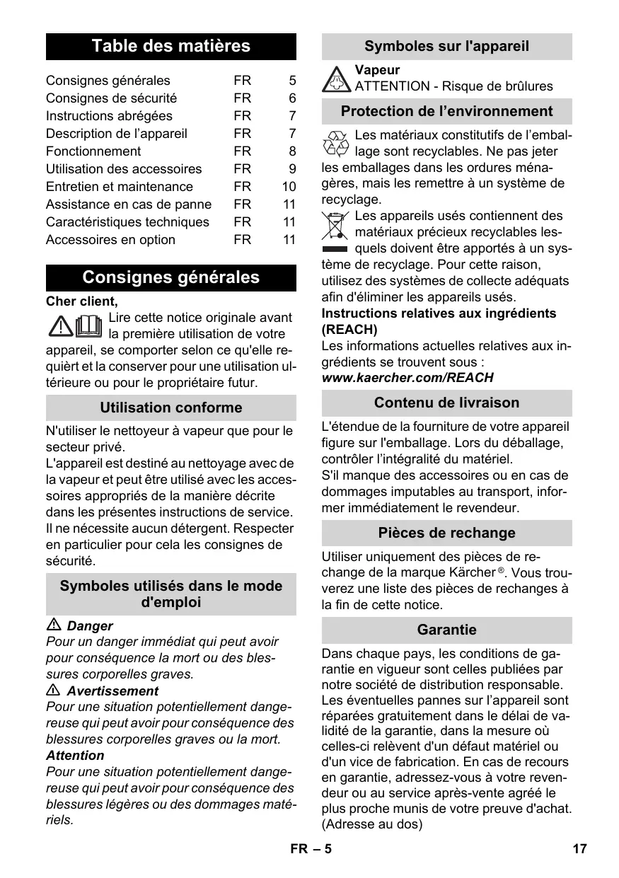 Vapeur ATTENTION - Risque de brûlures Protection de l’environnement Cher client, Lire cette notice originale avant la première utilisation de votre appareil, se comporter selon ce qu'elle requièrt et la conserver pour une utilisation ultérieure ou pour le propriétaire futur. Les matériaux constitutifs de l’emballage sont recyclables. Ne pas jeter les emballages dans les ordures ménagères, mais les remettre à un système de recyclage. Les appareils usés contiennent des matériaux précieux recyclables lesquels doivent être apportés à un système de recyclage. Pour cette raison, utilisez des systèmes de collecte adéquats afin d'éliminer les appareils usés. Instructions relatives aux ingrédients (REACH) Les informations actuelles relatives aux ingrédients se trouvent sous : www.kaercher.com/REACH Utilisation conforme Contenu de livraison N'utiliser le nettoyeur à vapeur que pour le secteur privé. L'appareil est destiné au nettoyage avec de la vapeur et peut être utilisé avec les accessoires appropriés de la manière décrite dans les présentes instructions de service. Il ne nécessite aucun détergent. Respecter en particulier pour cela les consignes de sécurité. L'étendue de la fourniture de votre appareil figure sur l'emballage. Lors du déballage, contrôler l’intégralité du matériel. S'il manque des accessoires ou en cas de dommages imputables au transport, informer immédiatement le revendeur. Consignes générales Symboles utilisés dans le mode d'emploi Pièces de rechange Utiliser uniquement des pièces de rechange de la marque Kärcher ®. Vous trouverez une liste des pièces de rechanges à la fin de cette notice. Danger Pour un danger immédiat qui peut avoir pour conséquence la mort ou des blessures corporelles graves. 몇 Avertissement Pour une situation potentiellement dangereuse qui peut avoir pour conséquence des blessures corporelles graves ou la mort. Attention Pour une situation potentiellement dangereuse qui peut avoir pour conséquence des blessures légères ou des dommages matériels. Garantie Dans chaque pays, les conditions de garantie en vigueur sont celles publiées par notre société de distribution responsable. Les éventuelles pannes sur l’appareil sont réparées gratuitement dans le délai de validité de la garantie, dans la mesure où celles-ci relèvent d'un défaut matériel ou d'un vice de fabrication. En cas de recours en garantie, adressez-vous à votre revendeur ou au service après-vente agréé le plus proche munis de votre preuve d'achat. (Adresse au dos) FR – 5